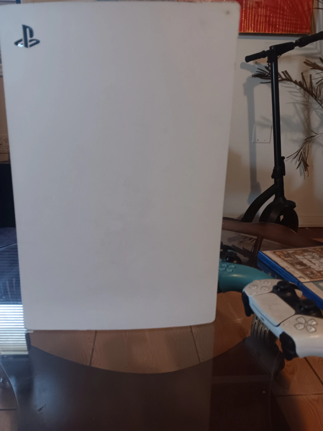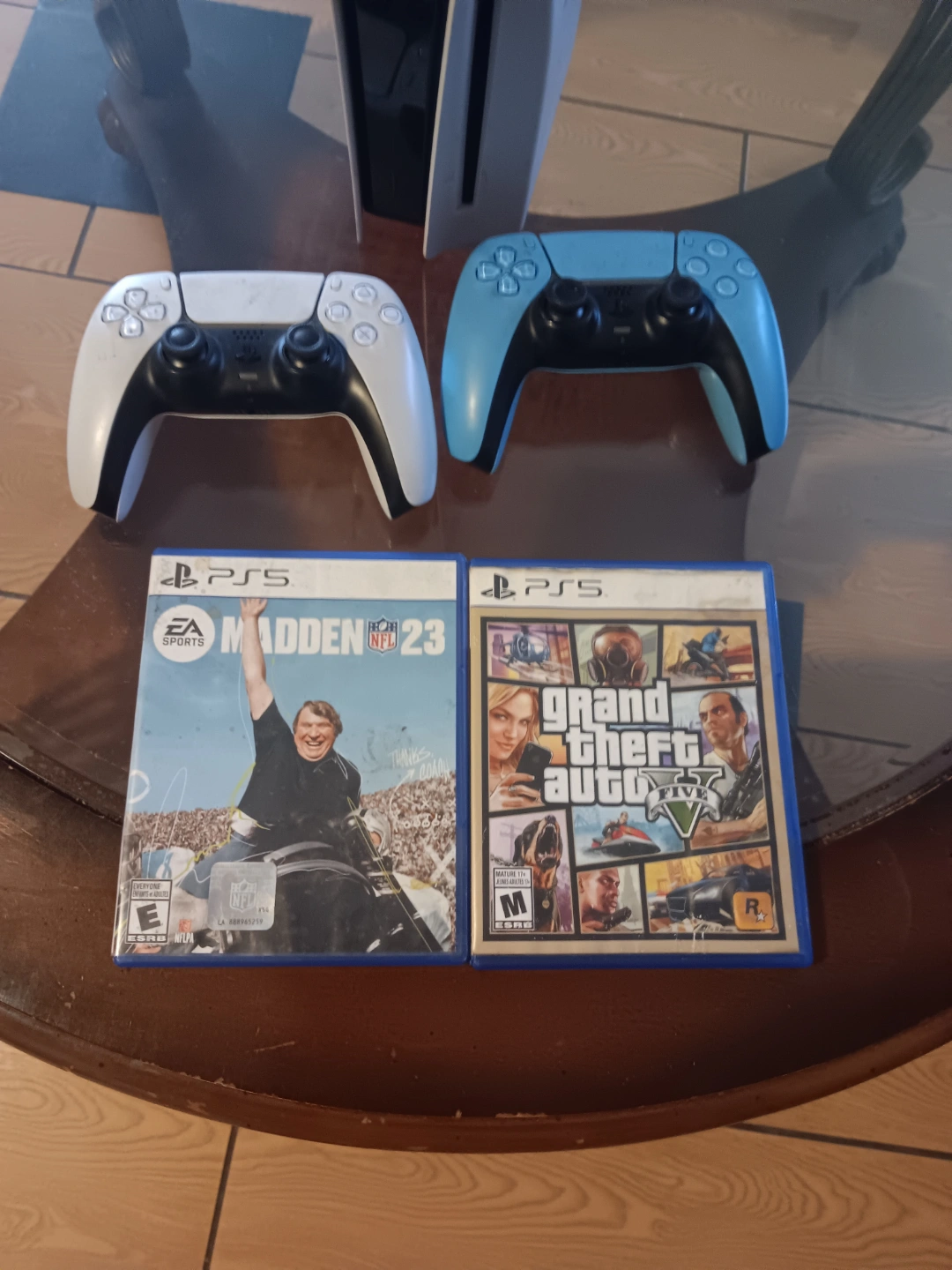 55White PlayStation 5 console. Includes two DualSense controllers, one white and one light blue. Madden NFL 23 and Grand Theft Auto V games included. Digital edition.