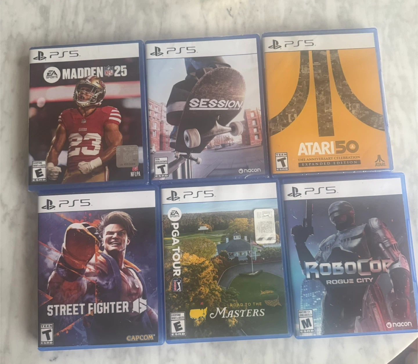 10Selling a collection of brand new PS5 games, still in original packaging. The games include: - Madden 25 - Session - Atari 50: The Anniversary Celebration Expanded Edition - Street Fighter - PGA Tour: Road to the Masters - Robocop: Rogue City
