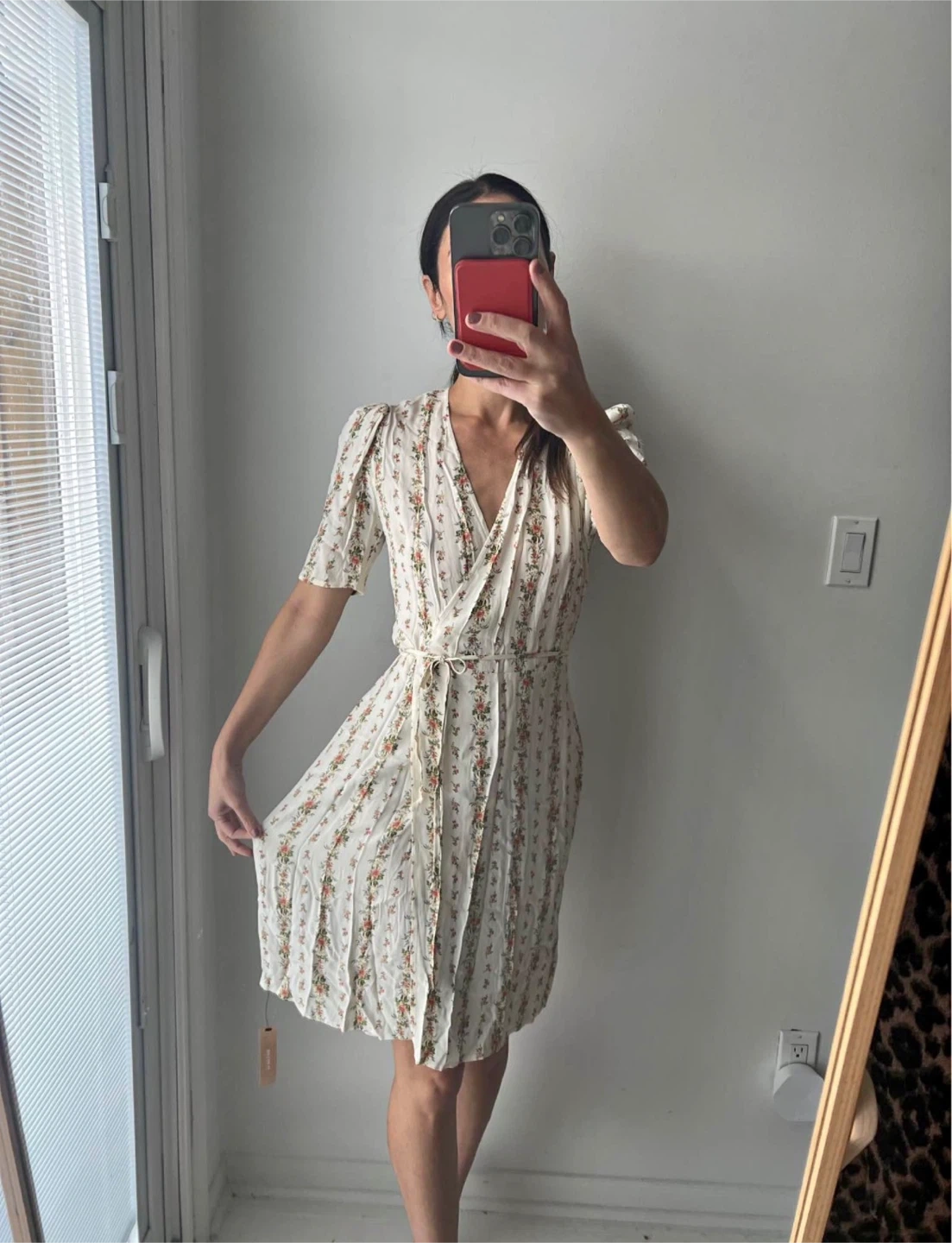 This is a gorgeous, functional wrap dress with a v neckline and structured shoulders for a more put together look. It has an adjustable waist tie so you can fit it to your liking.