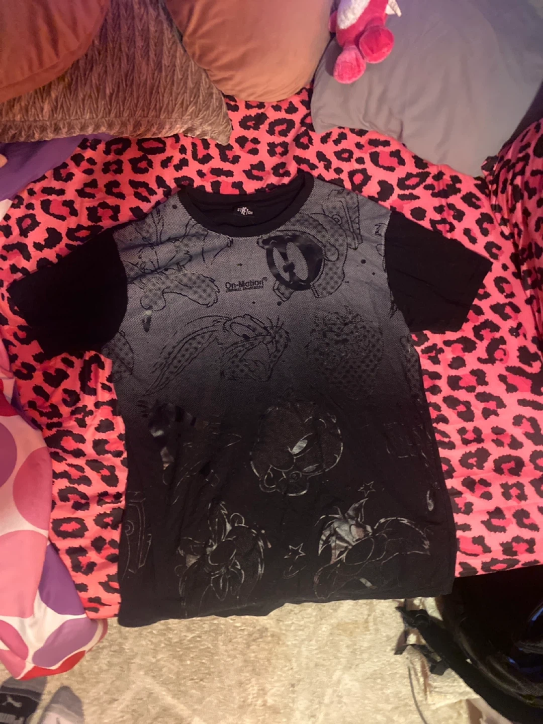 This t-shirt features a grey to black ombre design with various Looney Tunes characters printed all over. It's made of a soft, breathable material perfect for everyday wear. The crew neck and short sleeves offer a classic fit. Great for any fan of classic cartoons!