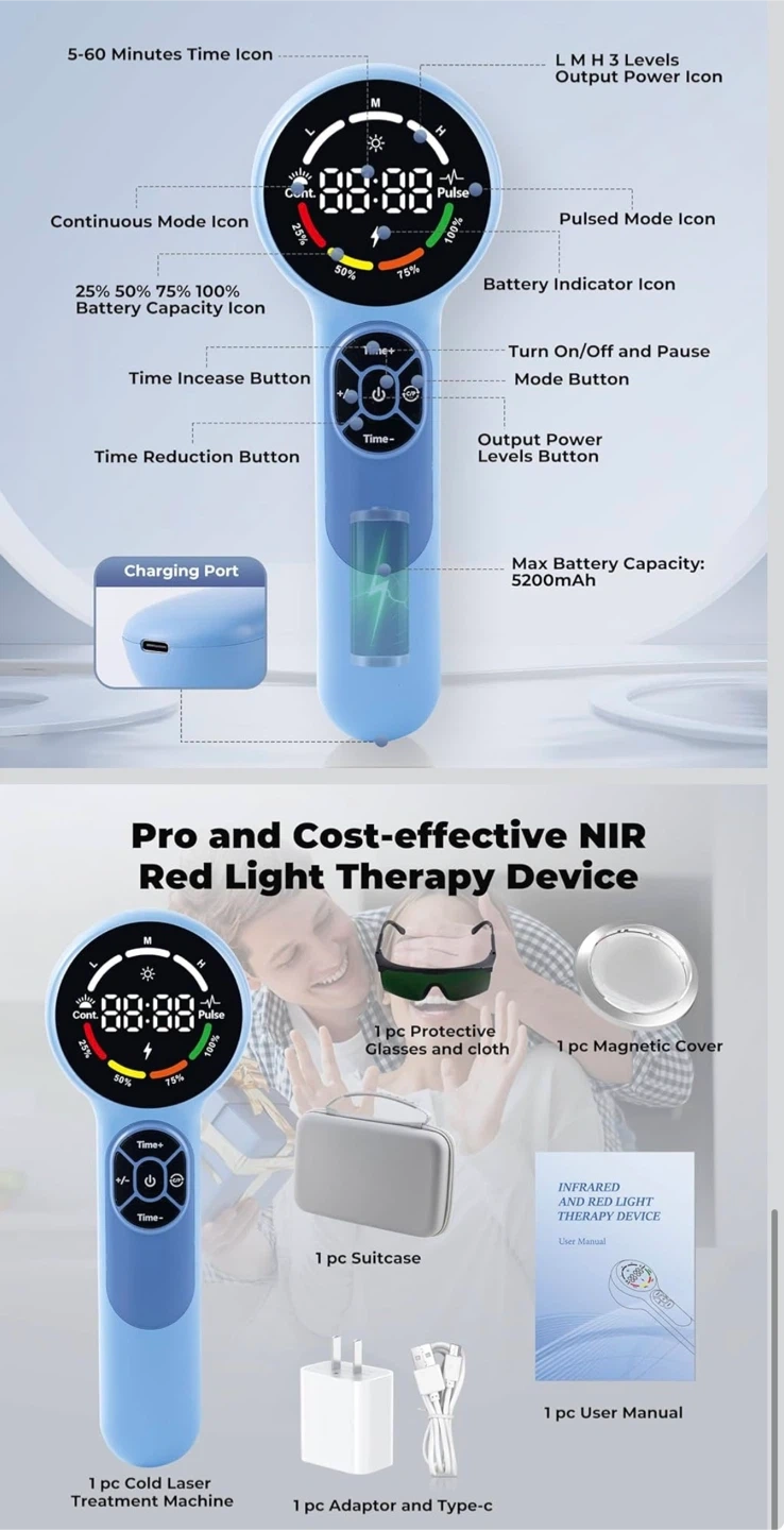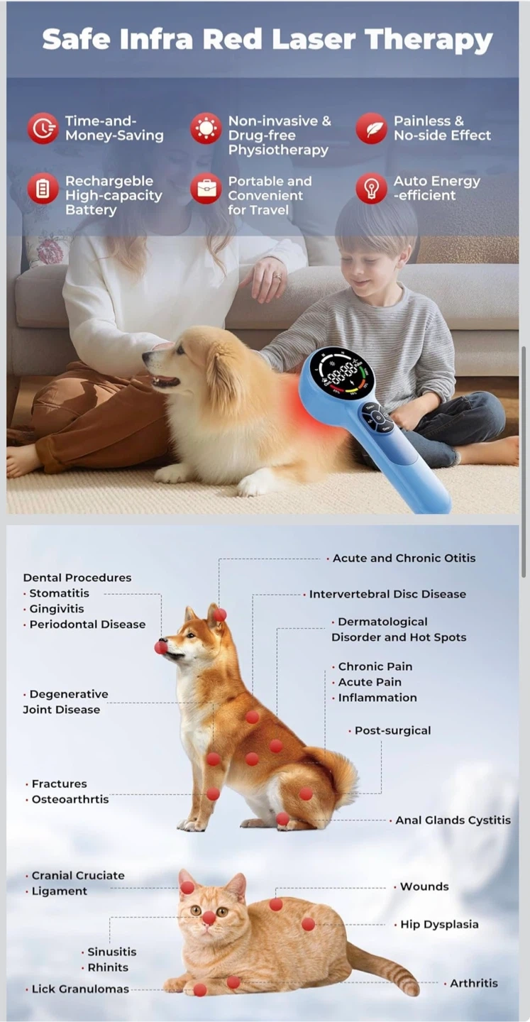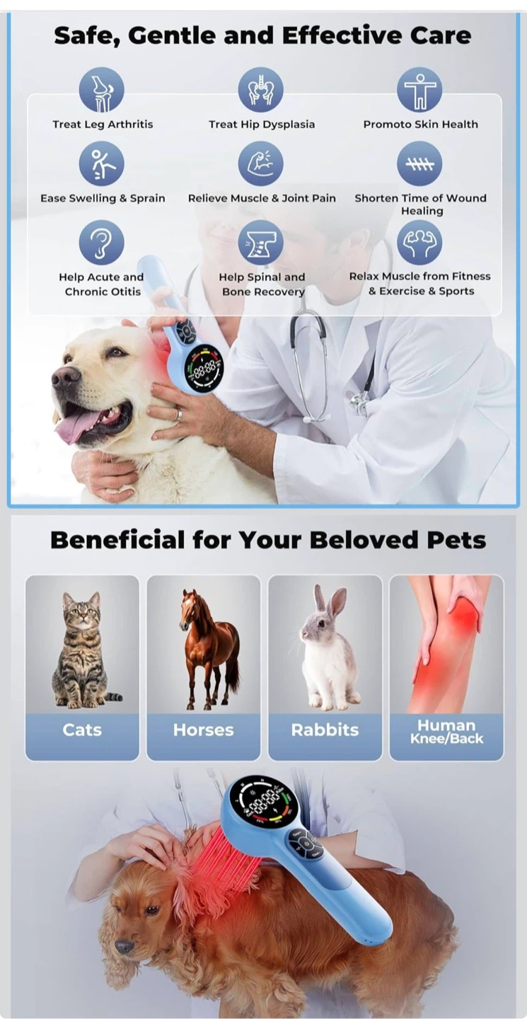 This device offers safe, non-invasive therapy for a variety of ailments in pets and humans. It's portable, rechargeable with a 5200mAh battery, and includes adjustable power levels and modes. Comes with protective glasses, magnetic cover, charging adapter, and a travel case.