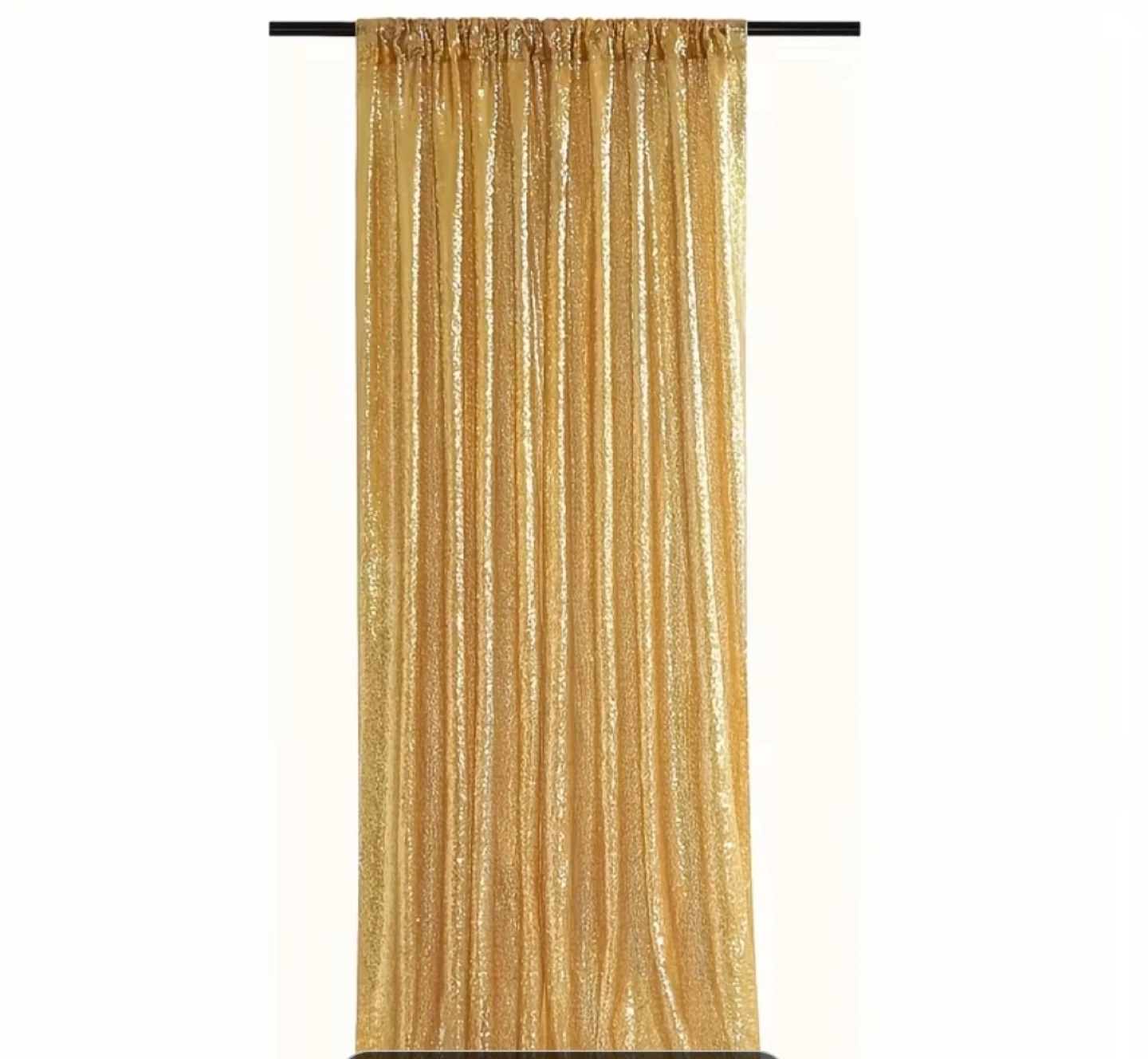 Sparkly gold sequin backdrop curtains. These measure 2 feet wide by 8 feet long. They're perfect for parties, weddings, or photo booths. The backdrop stand is not included.