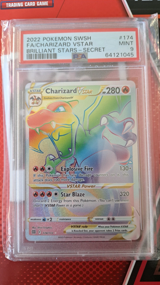 15Selling a graded Charizard VSTAR from the Brilliant Stars set! It's a secret rare and has been professionally graded by PSA as a 9 (Mint). Card Details: - Card: Charizard VSTAR - Set: Brilliant Stars - Rarity: Secret Rare - Grade: PSA 9 (Mint) - Year: 2022
