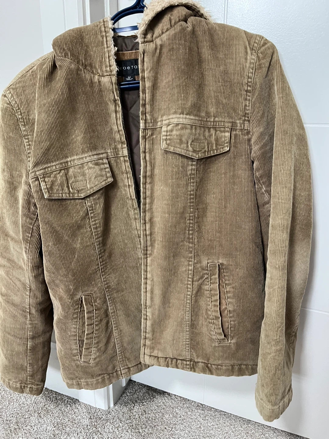 This jacket features a classic corduroy exterior and a cozy sherpa lining in the hood. It's a stylish and warm option for cooler weather. It has two chest pockets and two side pockets.