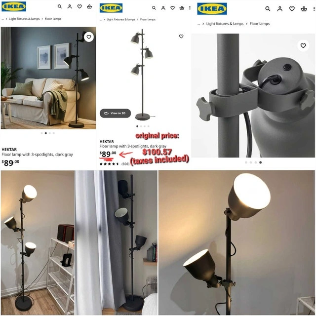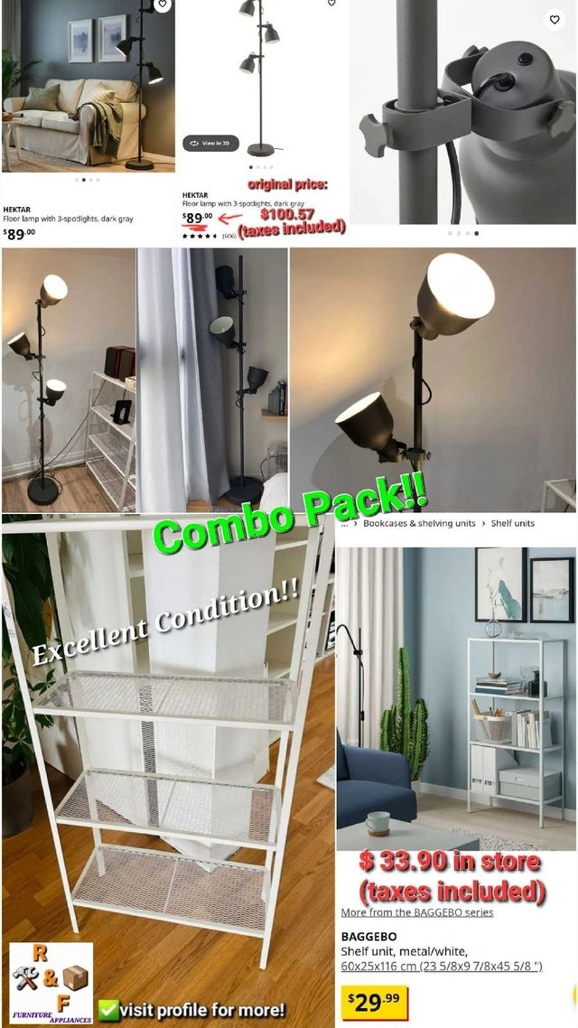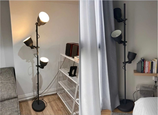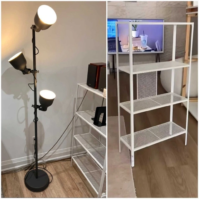 ➡️I'm offering a stylish IKEA Hektar floor lamp with three spotlights and a Baggebo shelf in excellent condition, perfect for adding both light and storage to any room. The lamp features adjustable heads for focused lighting, while the shelf provides ample space for books, decor, or storage.