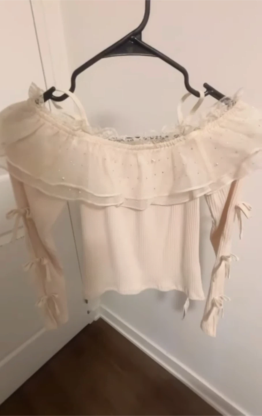 Cream-coloured off-the-shoulder top. It has a ruffled neckline with delicate bead detailing and features adjustable tie details on the sleeves. Ribbed knit material.