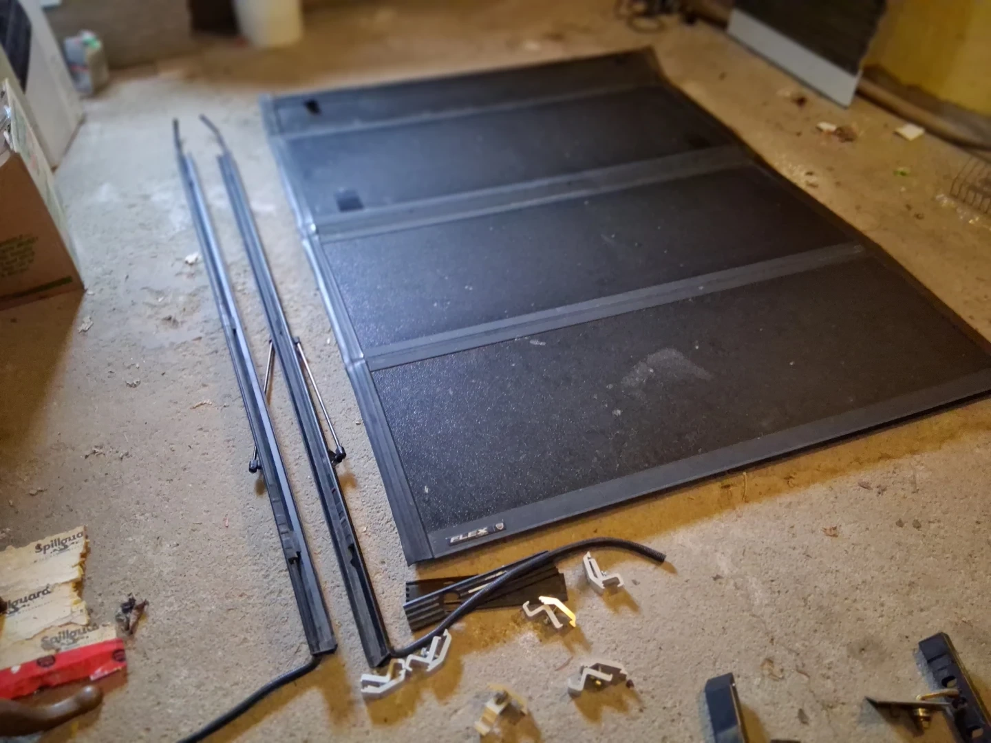 This is a FLEX tonneau cover for a pickup truck. It appears to be a tri-fold design. All mounting hardware is included. It's made of a durable, textured material.