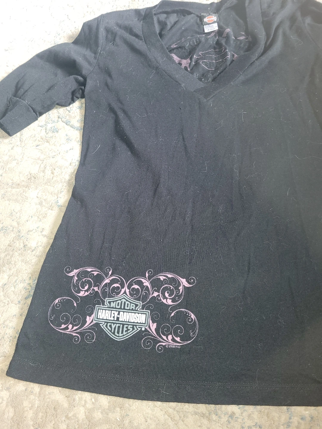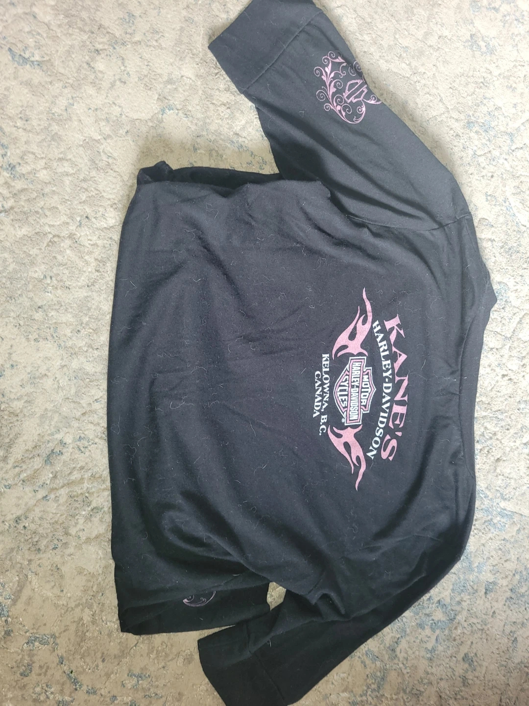 This is a black long-sleeved shirt from Harley-Davidson, featuring "Kane's" on the back with flame graphics. It's a v-neck style with decorative scrollwork and the Harley-Davidson logo. The shirt also has a Harley-Davidson logo and scroll design on the left sleeve cuff.