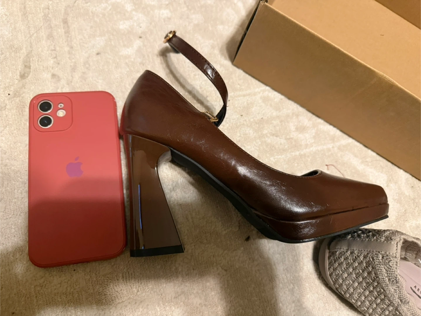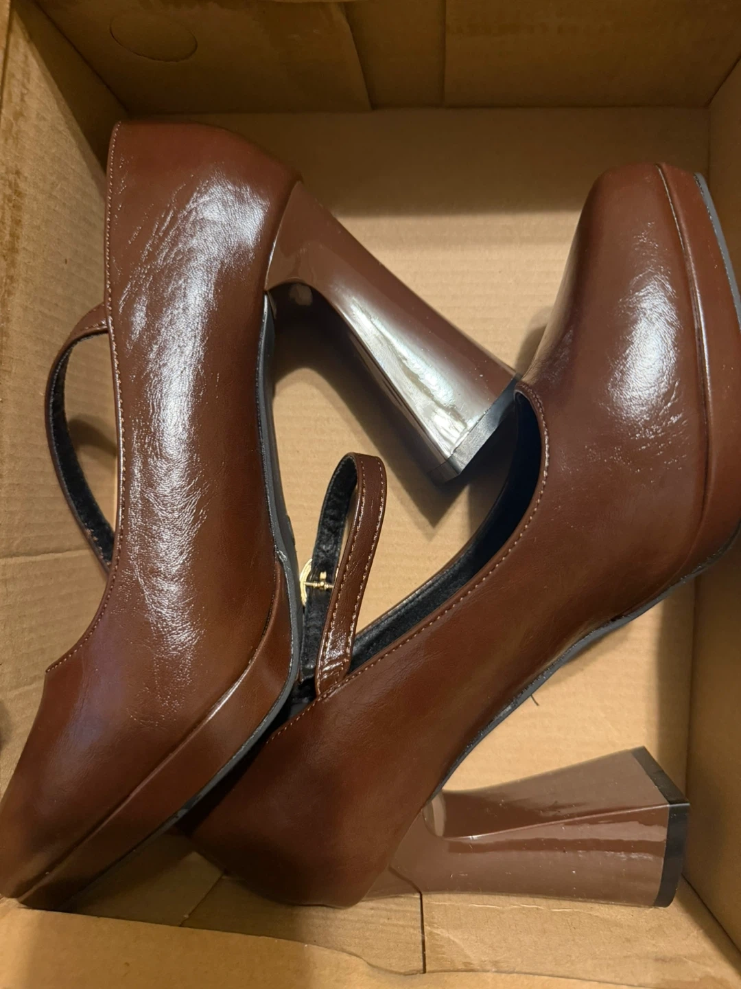These stylish brown Mary Jane heels feature a chunky platform and a secure ankle strap. The faux leather material gives them a polished look. Size is 37.