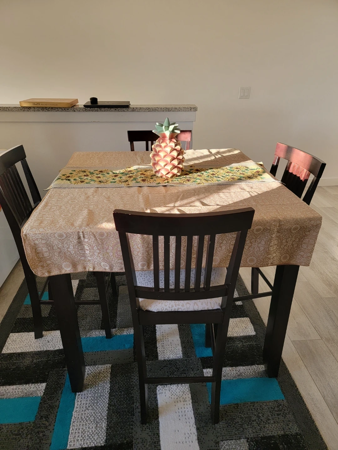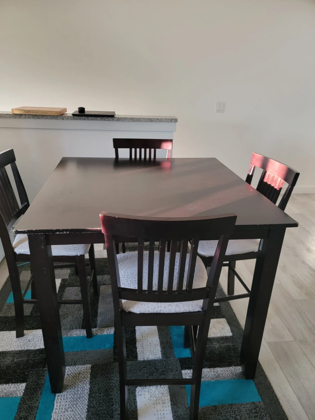 Set of 4 Dark Wood Counter Height Chairs with Patterned Seats