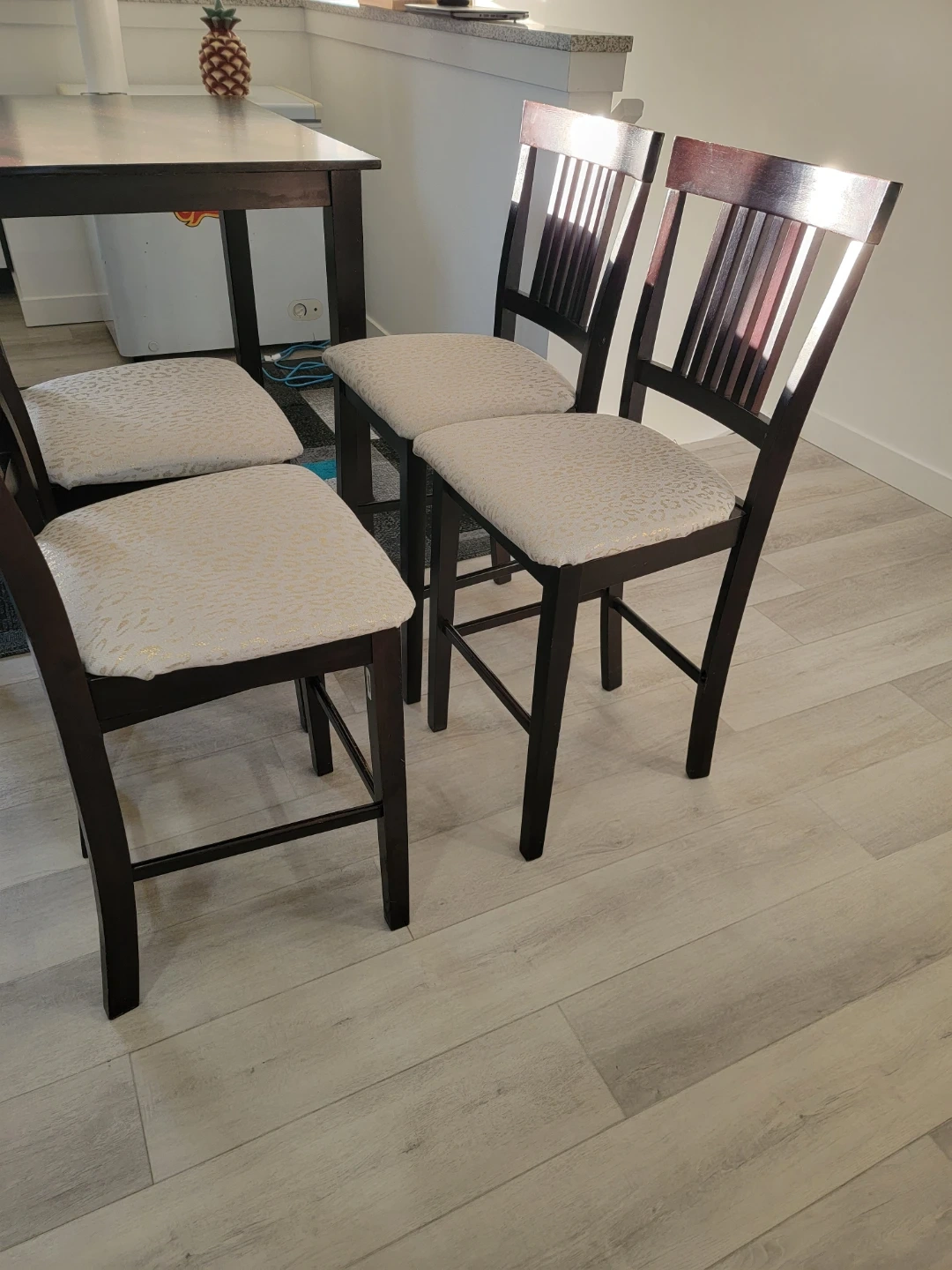 Four counter height chairs with dark wood frames and light-coloured seats featuring a subtle pattern. The seats are padded for comfort. These chairs are suitable for a kitchen island or counter.