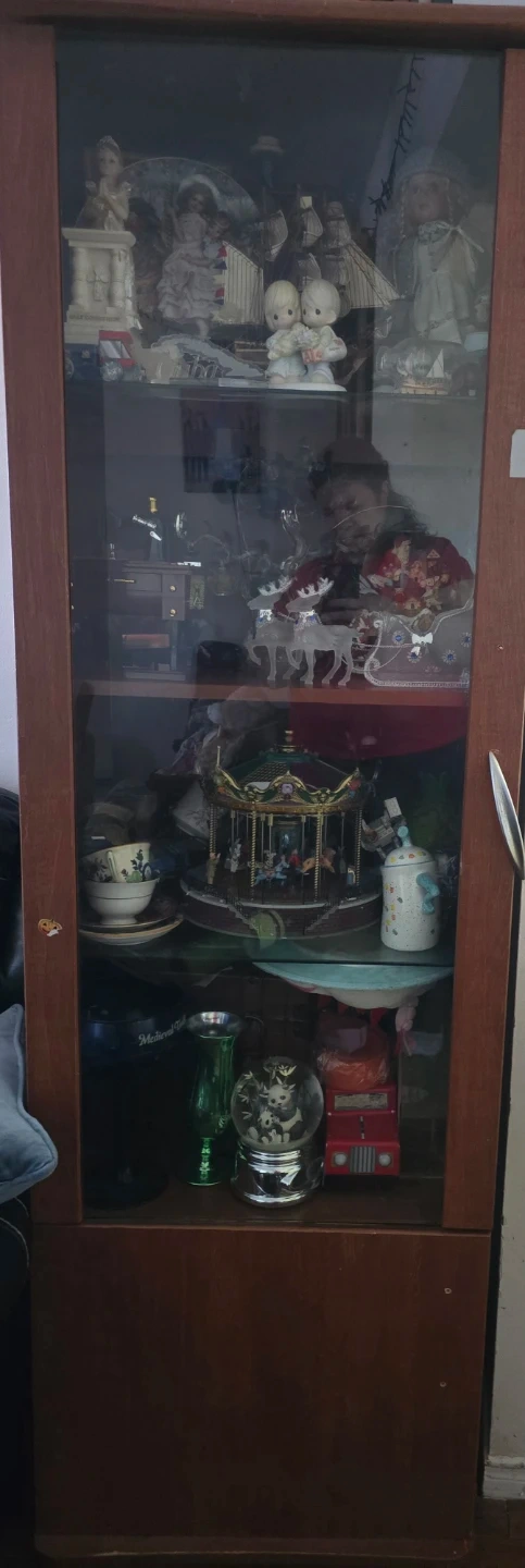 Tall display cabinet with two glass doors and two lower doors. It has multiple shelves perfect for showcasing collectibles or decorative items. The wood finish is a warm brown tone.