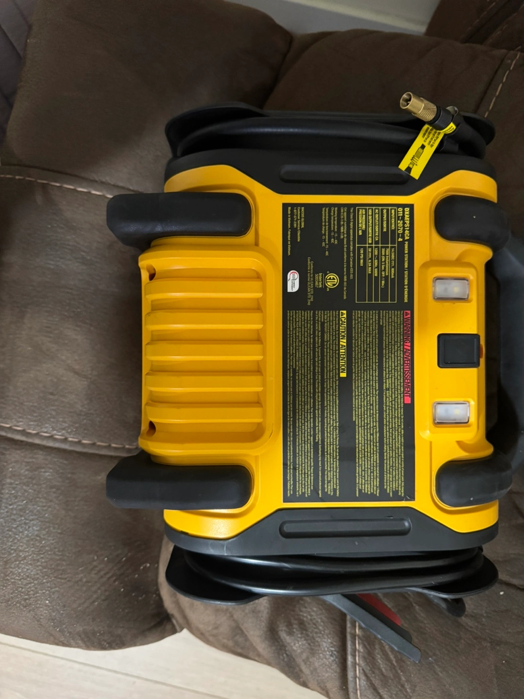 Portable inflator, compressor, and jump starter. Yellow and black. Multiple ports and controls. Includes cords. need to replace the battery