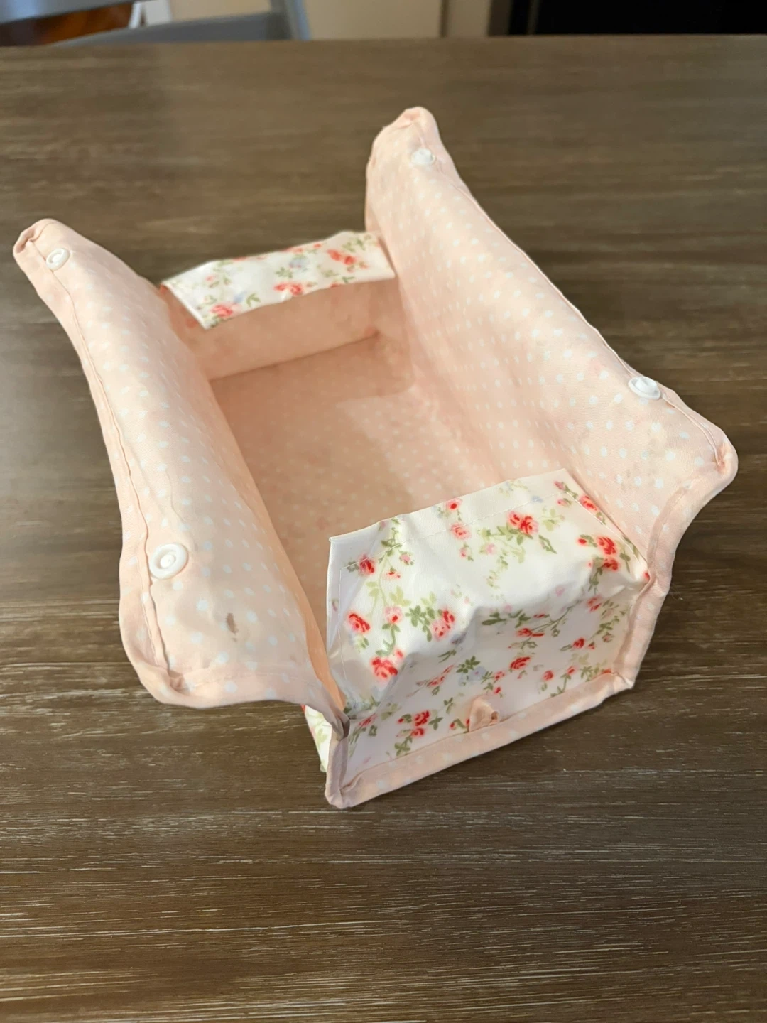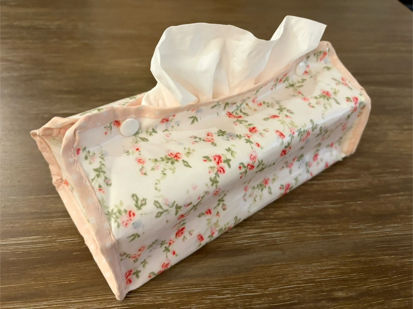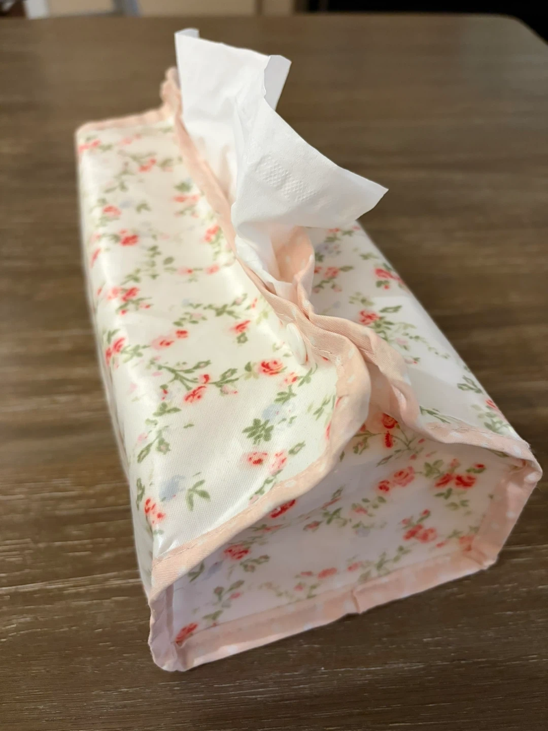 Pretty floral tissue box cover with a pink trim and polka dot lining. Snaps shut for a neat appearance. It fits a standard rectangular tissue box.