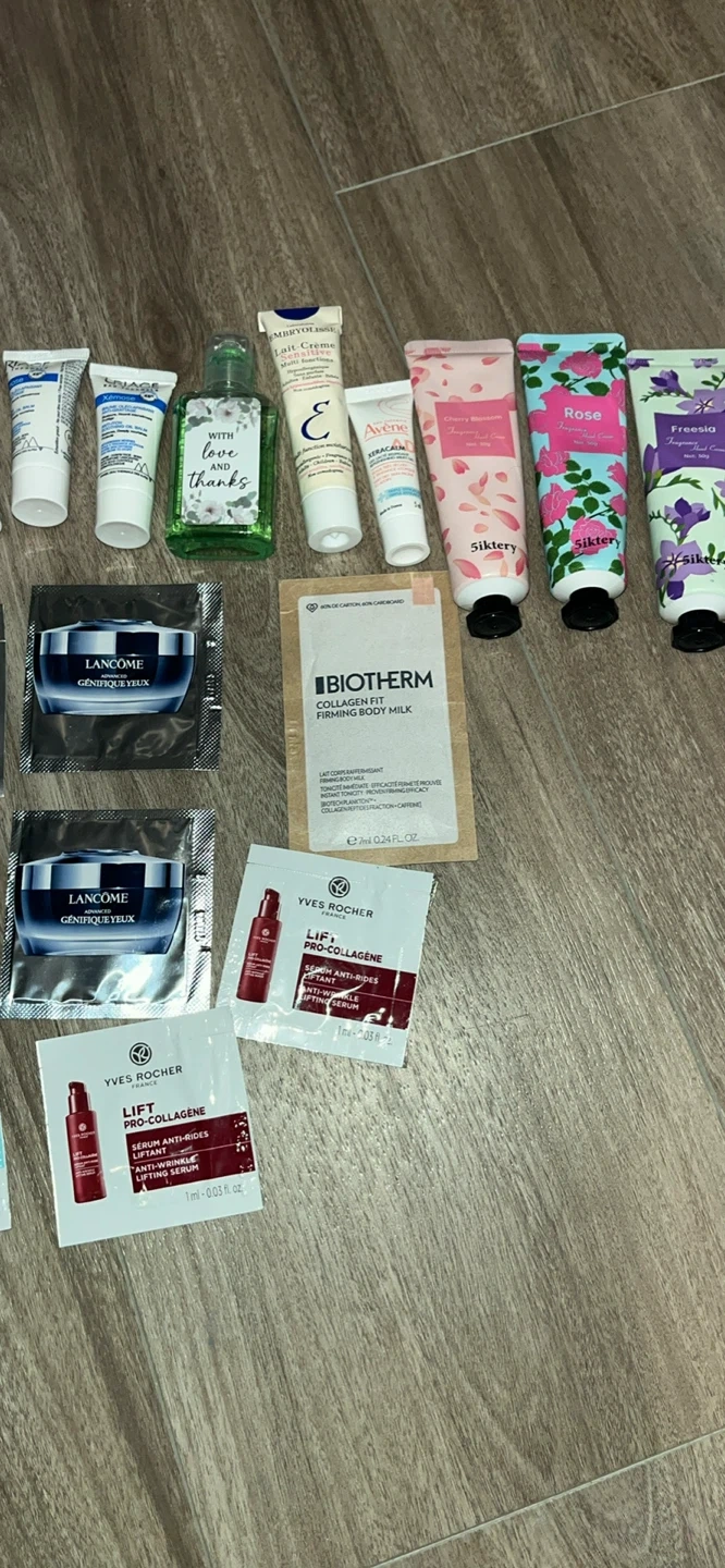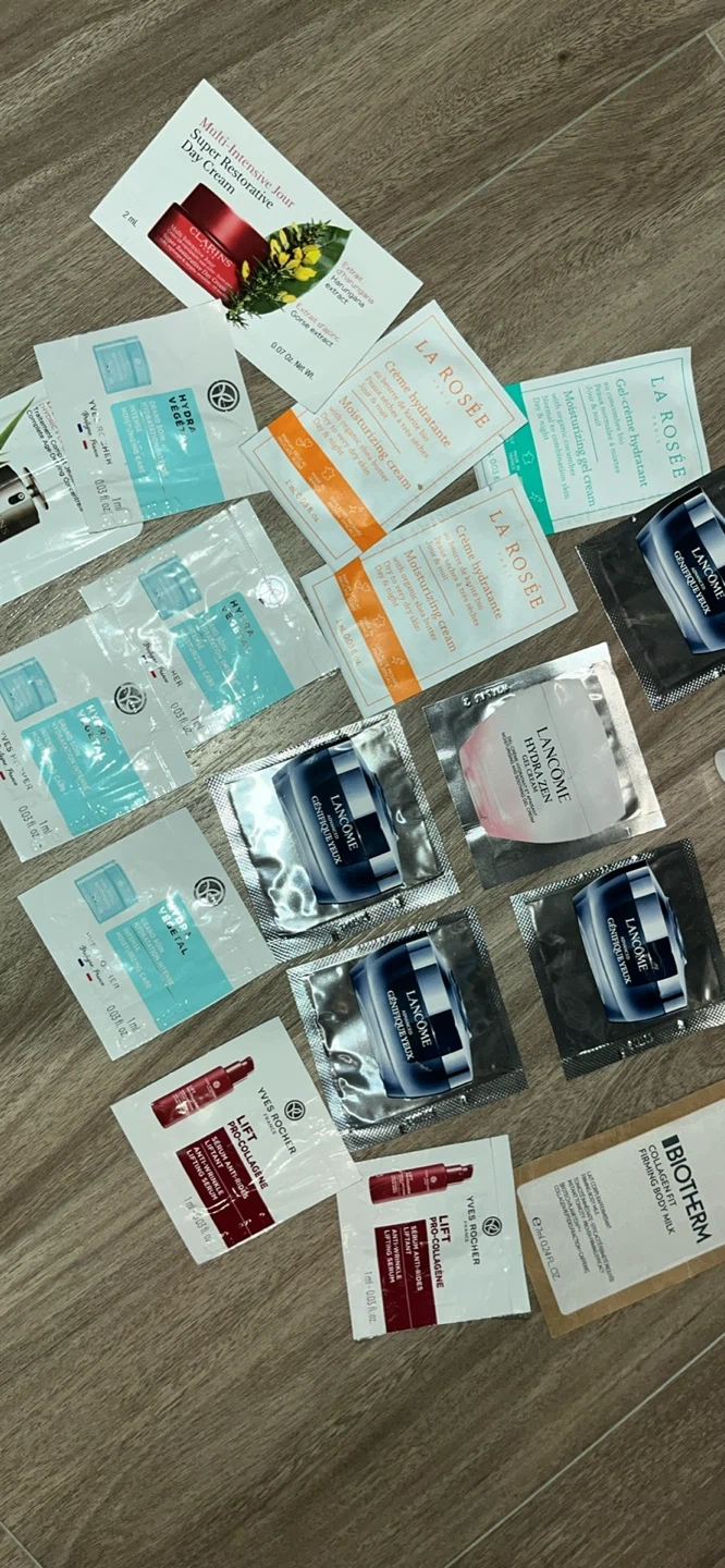 A collection of various skincare samples. Includes items from brands like Lancôme, Biotherm, La Rosée, and Yves Rocher. Perfect for trying out different products. Open to all offers just want good