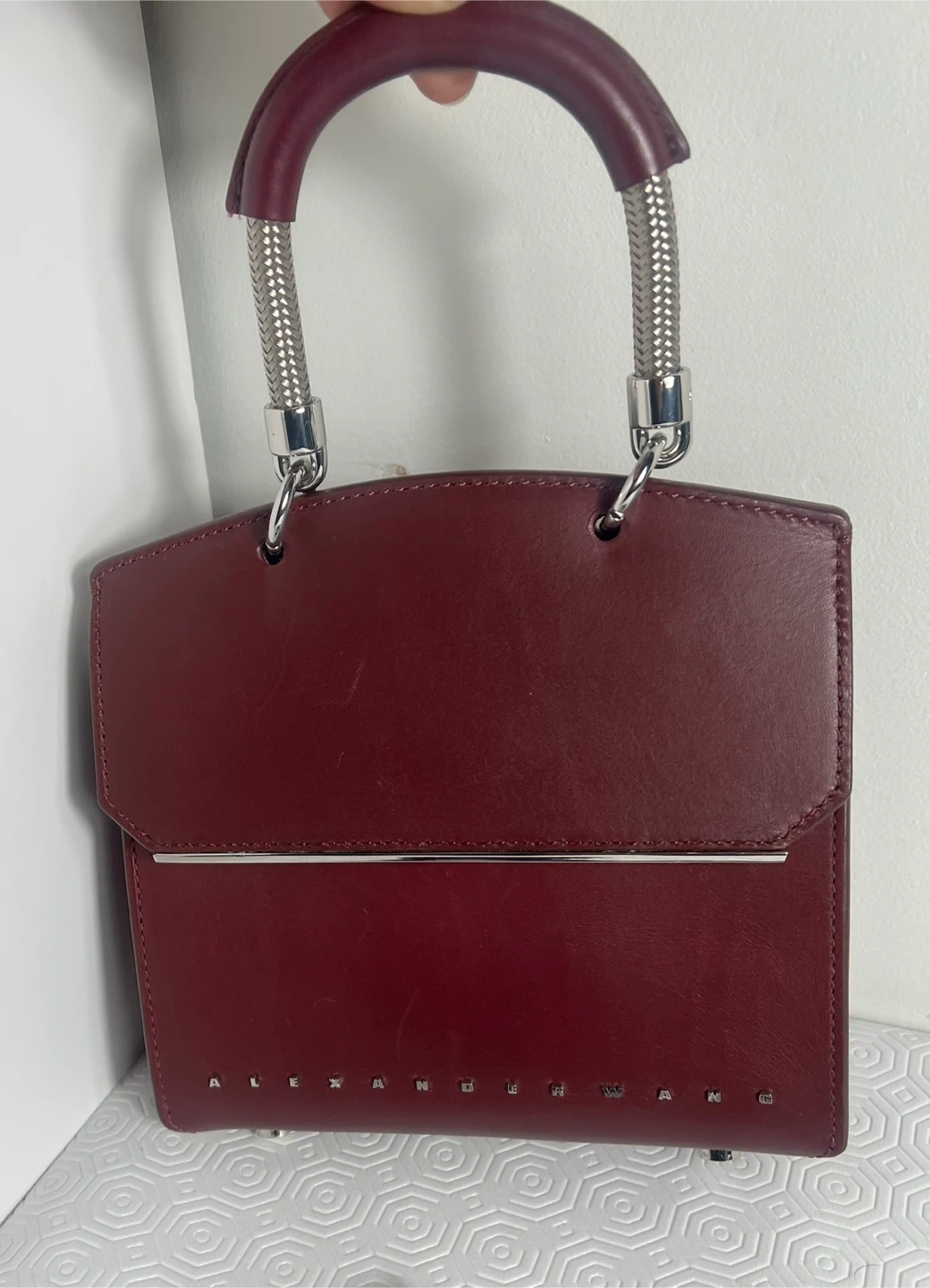Beautiful Alexander Wang satchel bag in a deep maroon leather. It features silver-toned hardware and decorative studs along the front. Comes with a detachable shoulder strap and dust bag. 7x7