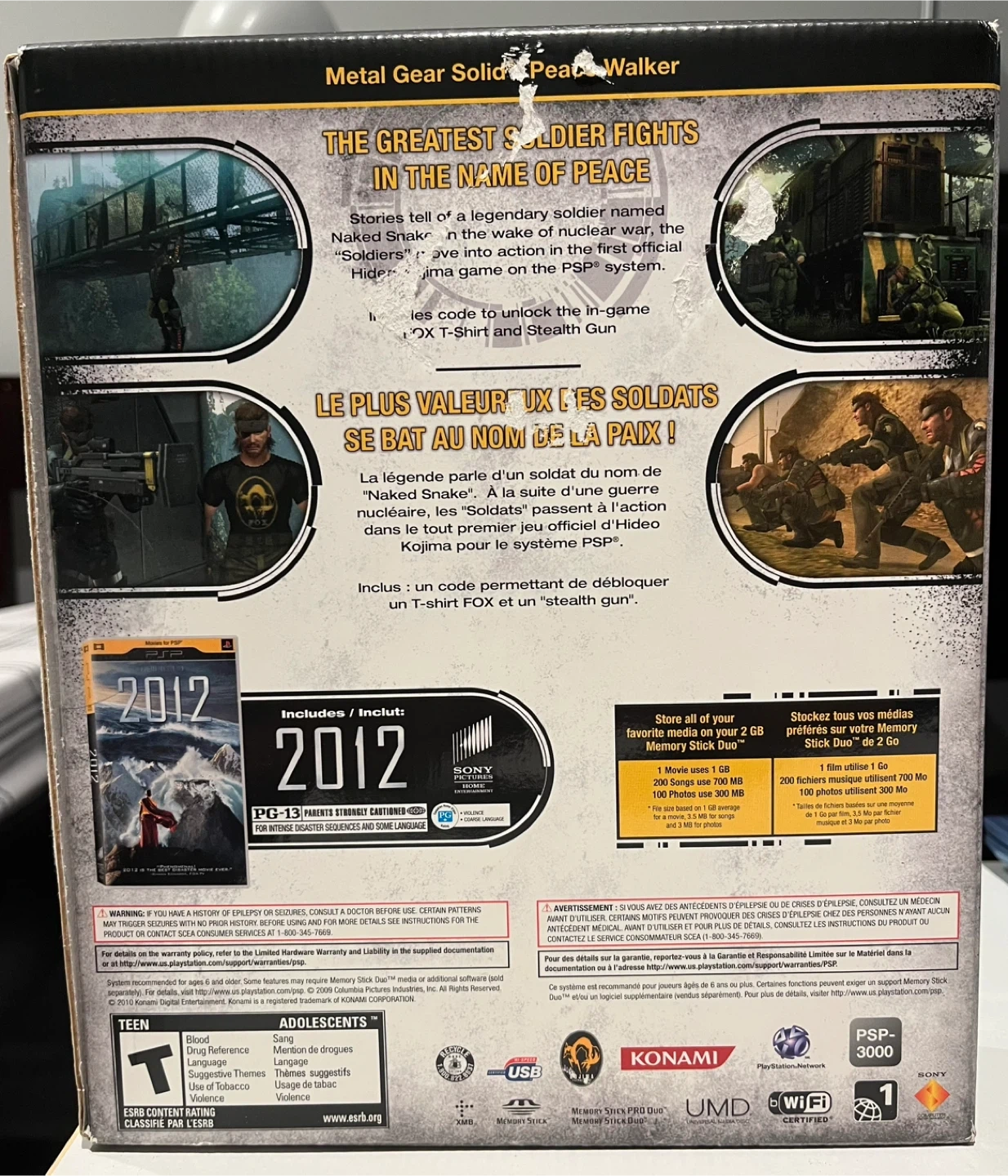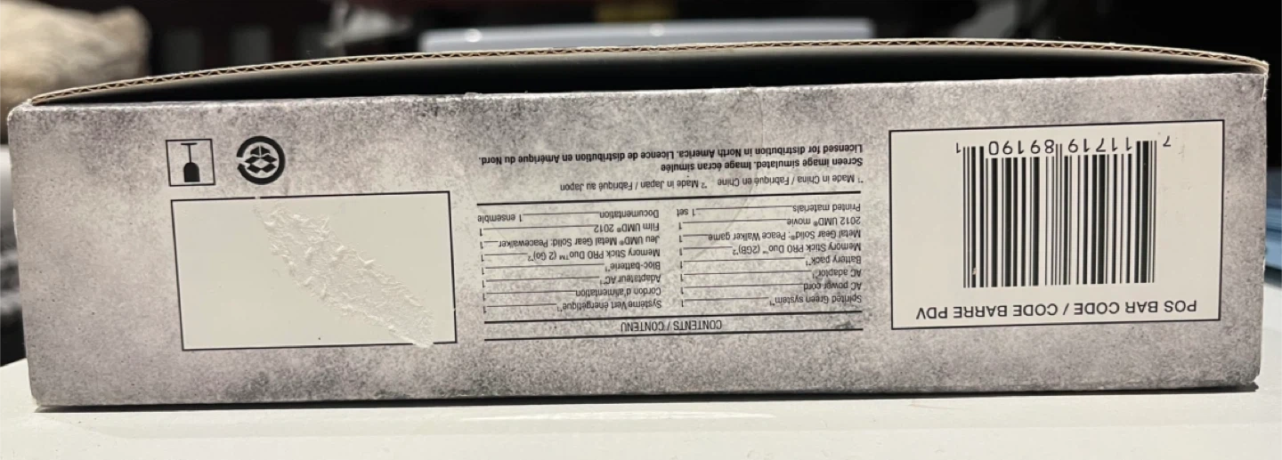 The box has heavy wear on it. The system itself is in immaculate condition, disk drive runs smoothly and quietly. The console was barely used, battery holds charge really well. A few blemished spots on the back which I circled on the picture. A few minor scratches on the screen. All games have manuals except for MGS: Peace Walker which is loose. All UMDs are tested and it's in great condition. All case artworks are in great condition except for Portable Ops which has water damaged to it. Comes with charger, 2 memory cards, console pouch and UMD pouch that holds 8 UMDs. Price is firm, it's rare to find one that has the box. Compare this to recent sold ones on eBay without the games, this is a steal. Mine is almost CIB and it comes with good games. I'm the second owner of this console.