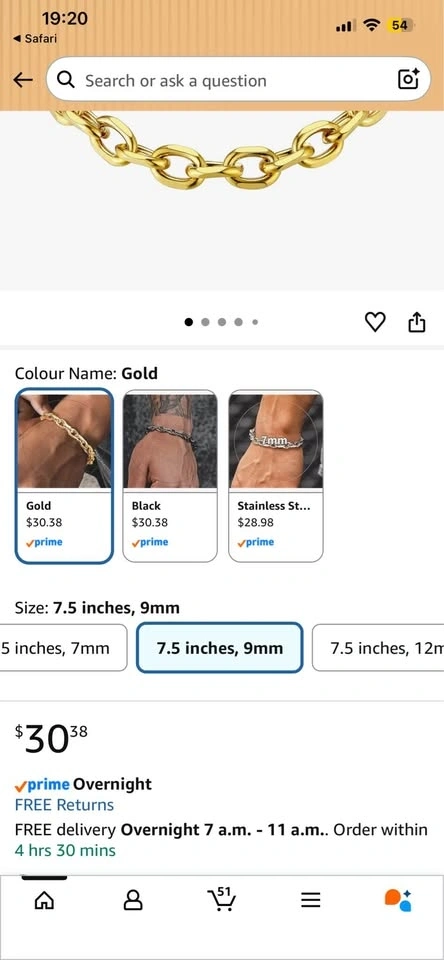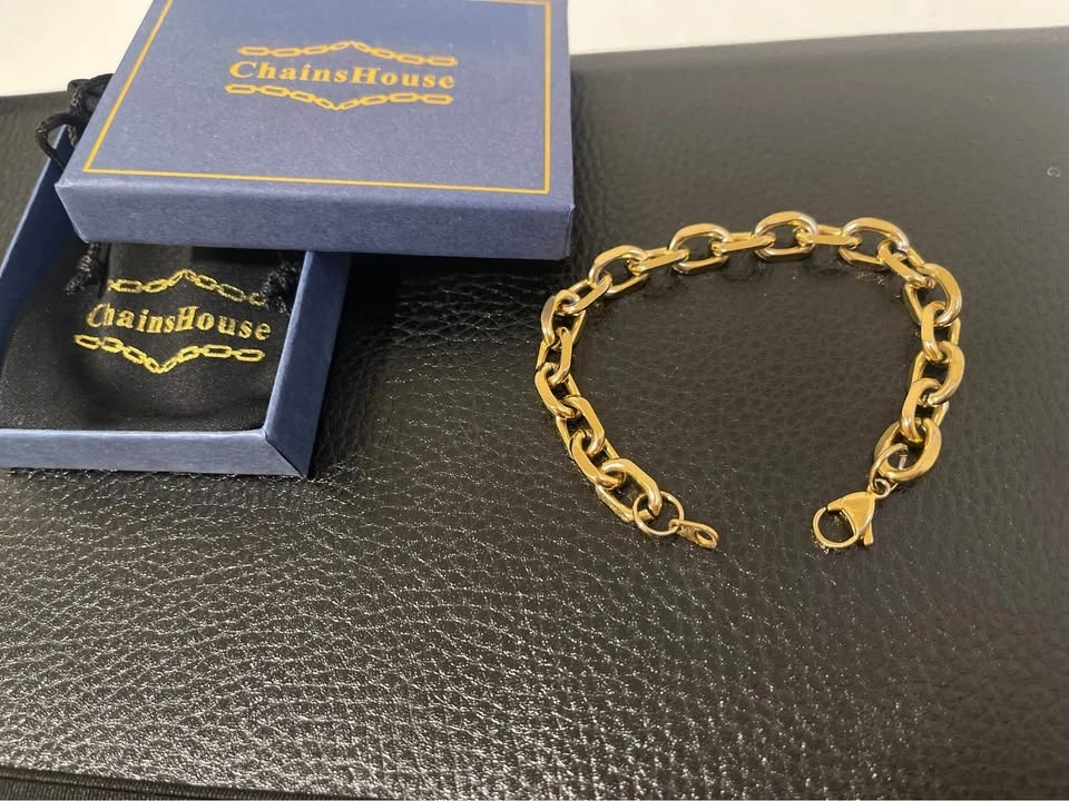 Polished gold-toned stainless steel chain bracelet from ChainsHouse. This piece is 7.5 inches long with a 9mm width. It has a secure lobster claw clasp and comes with the original blue brand box and black drawstring pouch.