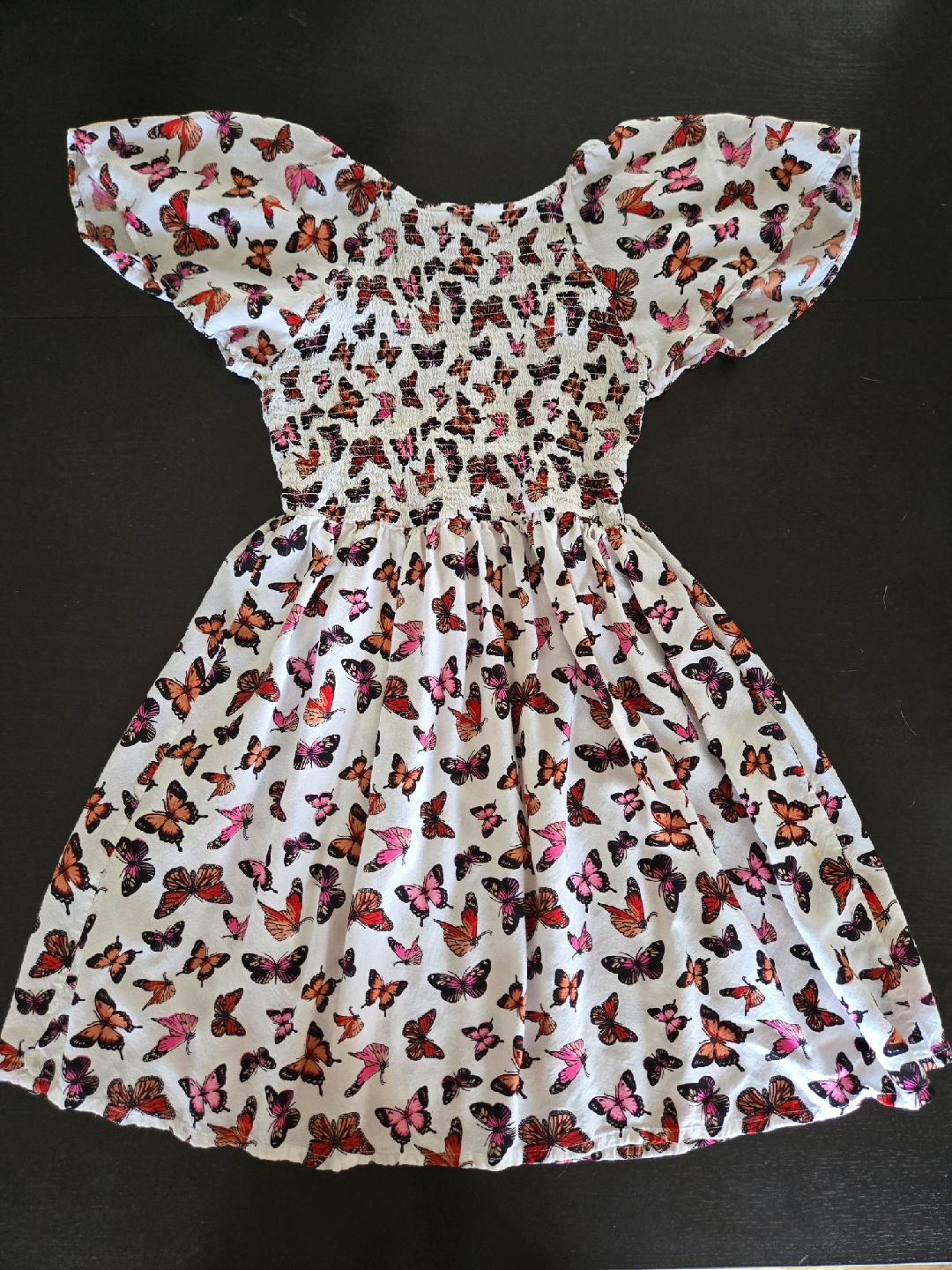A cute dress with an all-over butterfly print! It features a smocked bodice and short sleeves. Perfect for a sunny day out. Medium.