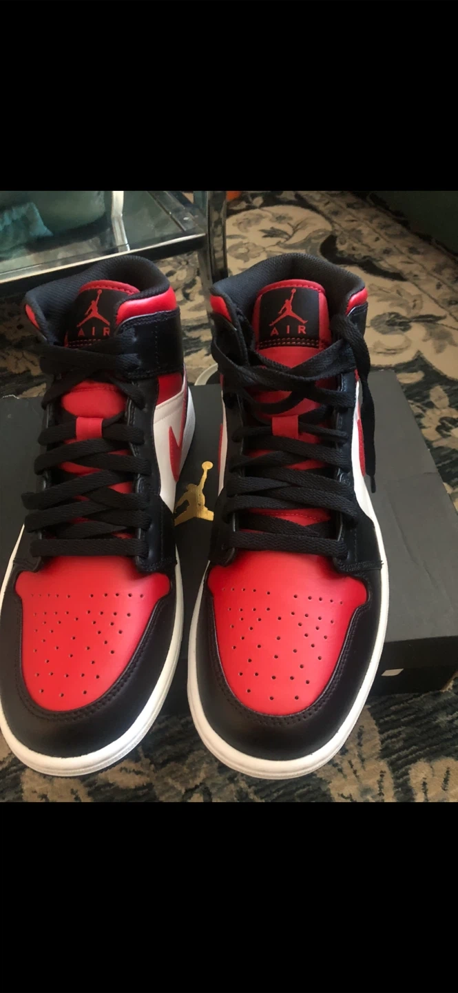 These Air Jordan 1 Mid SE sneakers come in a classic red, black, and white colourway. They feature a mid-top silhouette with laces for closure. The shoes include the original box and packaging.