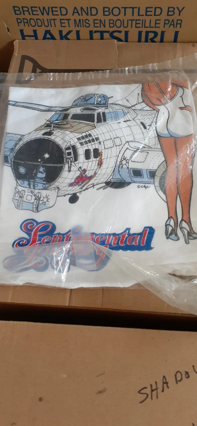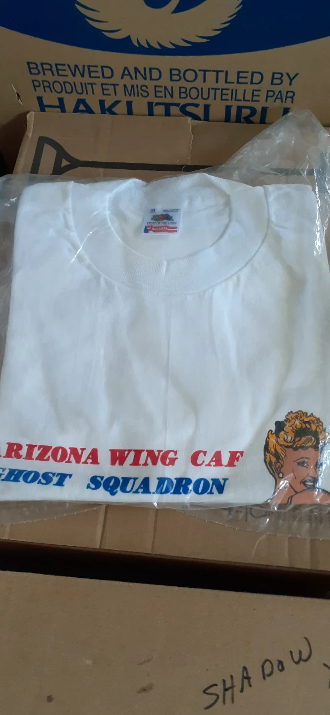 White t-shirt featuring a graphic of a bomber airplane and "Sentimental" text. It also displays "Arizona Wing CAF Ghost Squadron" text and artwork. Tag indicates size medium.wallhanger.