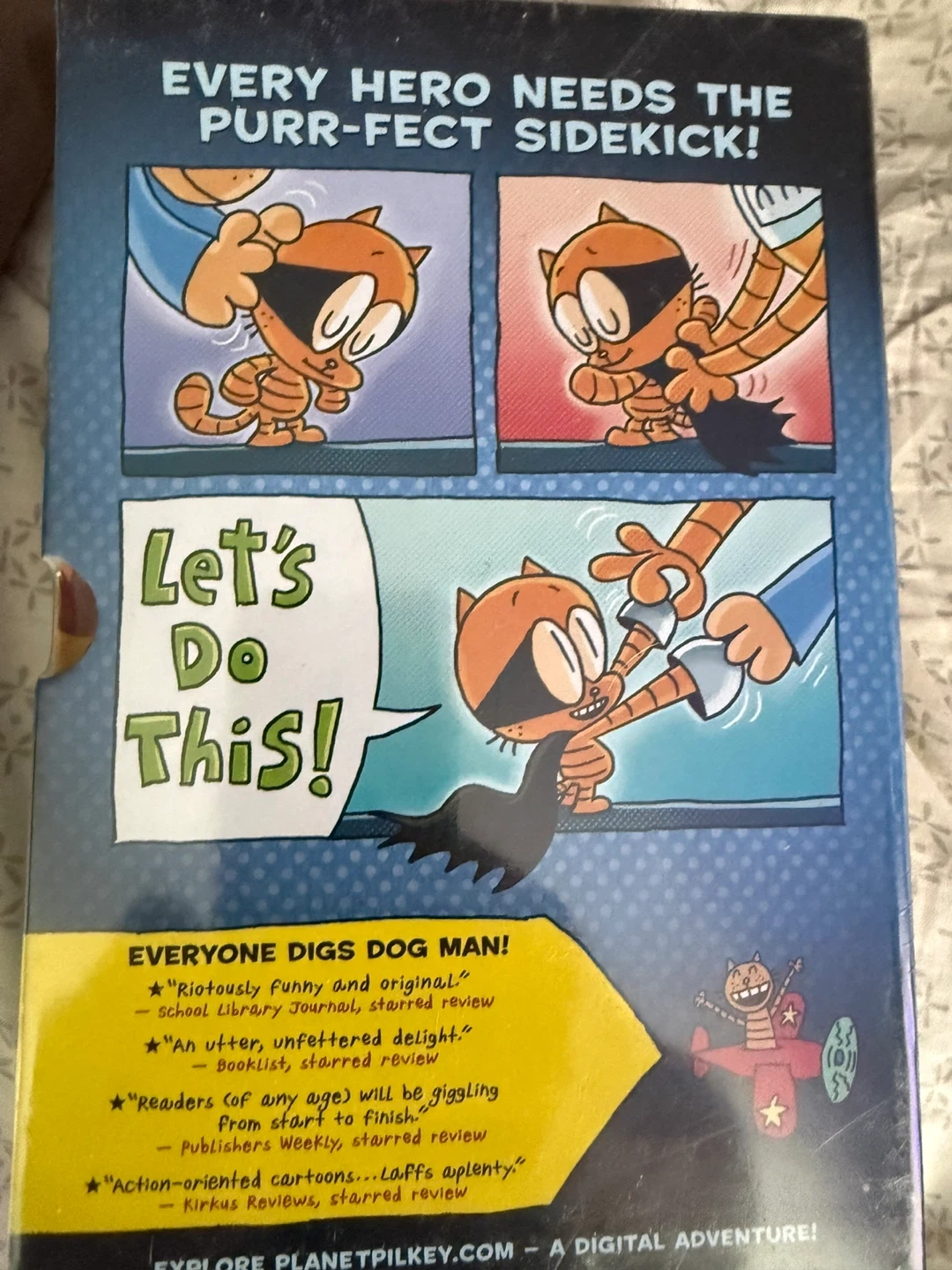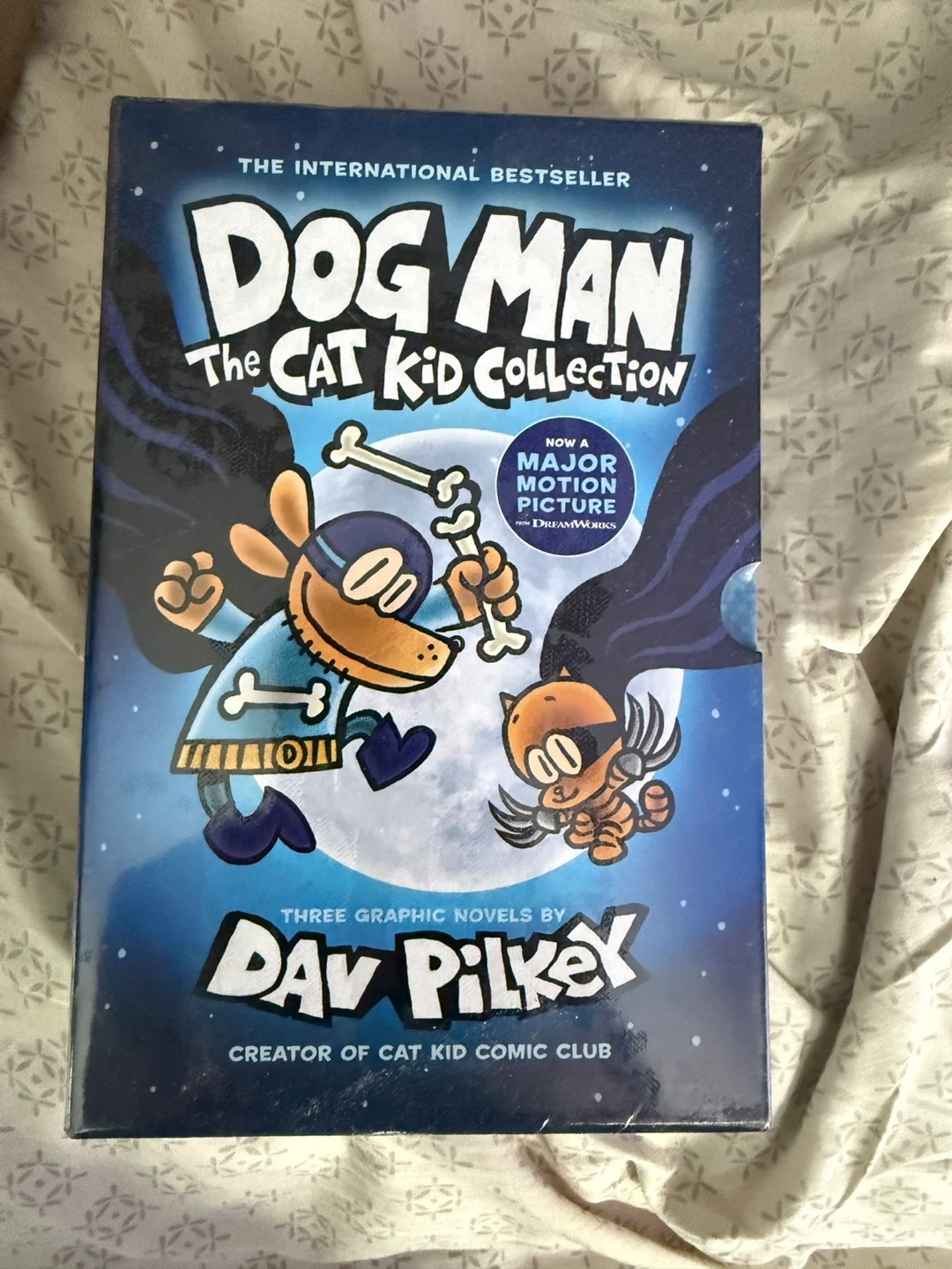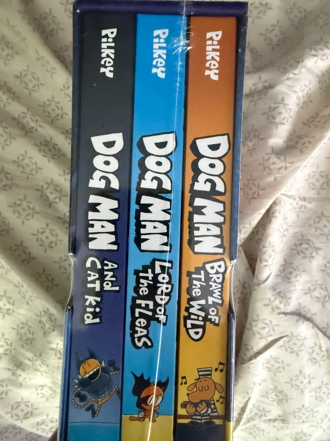 This box set includes three Dog Man graphic novels by Dav Pilkey. It features 'Dog Man and Cat Kid,' 'Dog Man: Lord of the Fleas,' and 'Dog Man: Brawl of the Wild.' Perfect for young readers who enjoy humorous comic books!