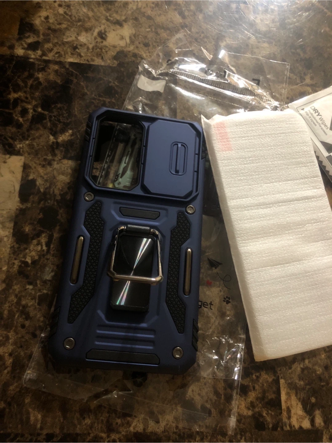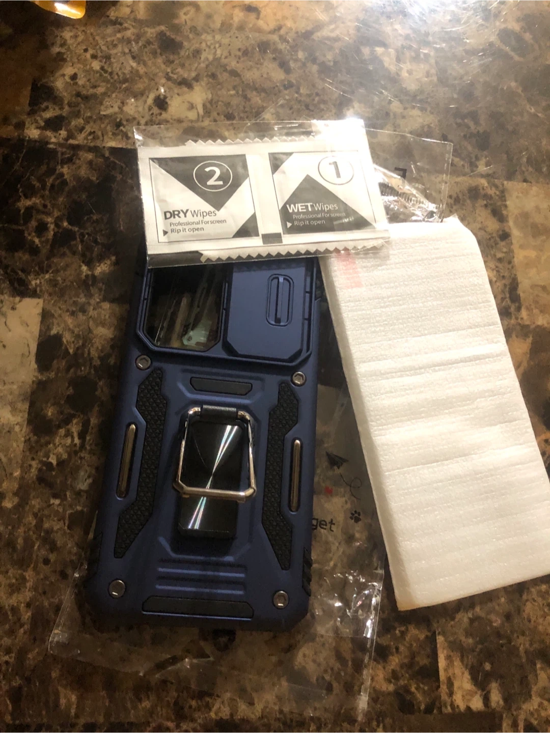 I'm selling a brand new blue Samsung Glaxy S24/S25 case that comes with a handy ring stand. It also includes wet and dry wipes for screen cleaning, ensuring your phone stays spotless. The case is still in its original packaging!