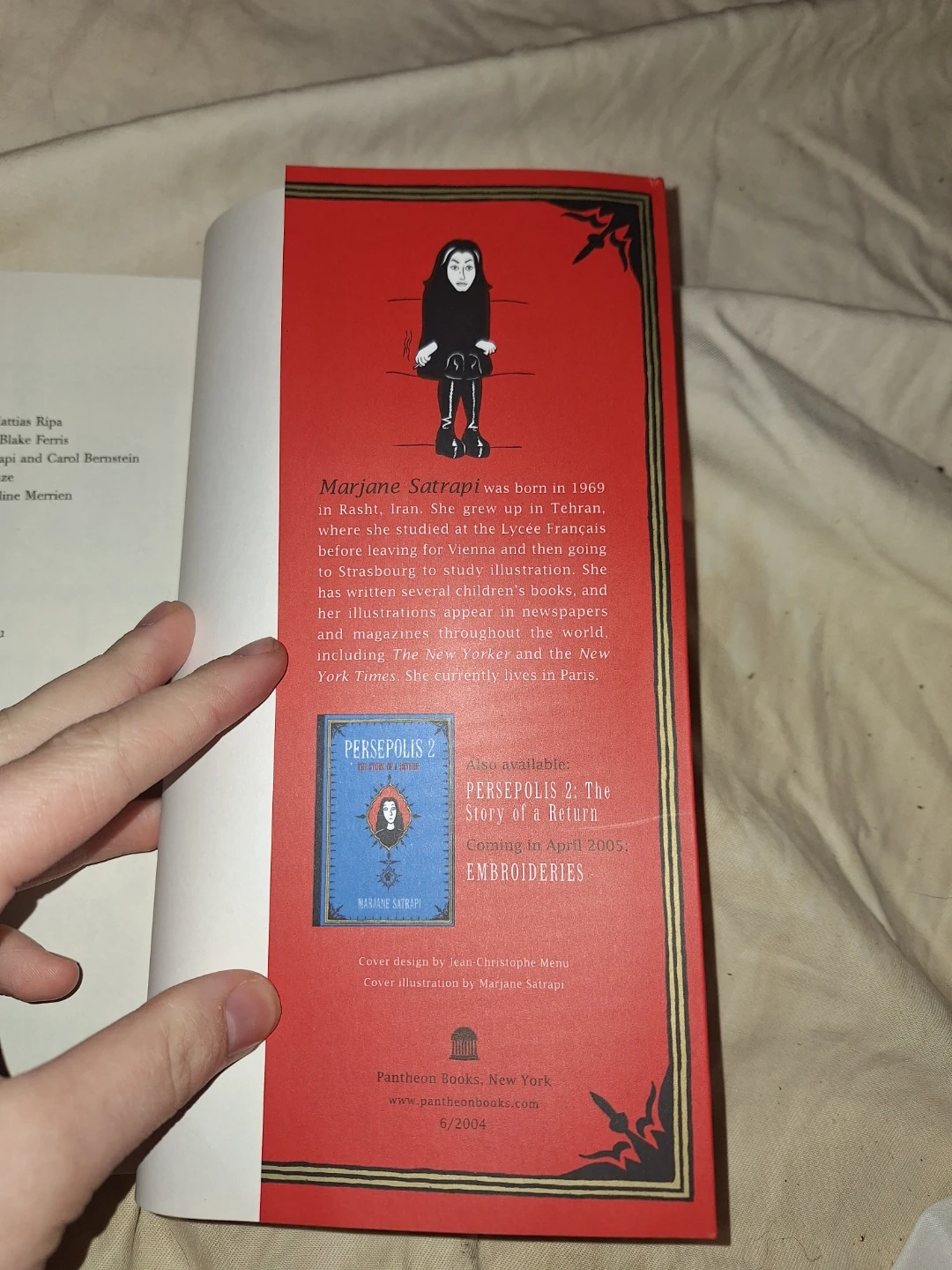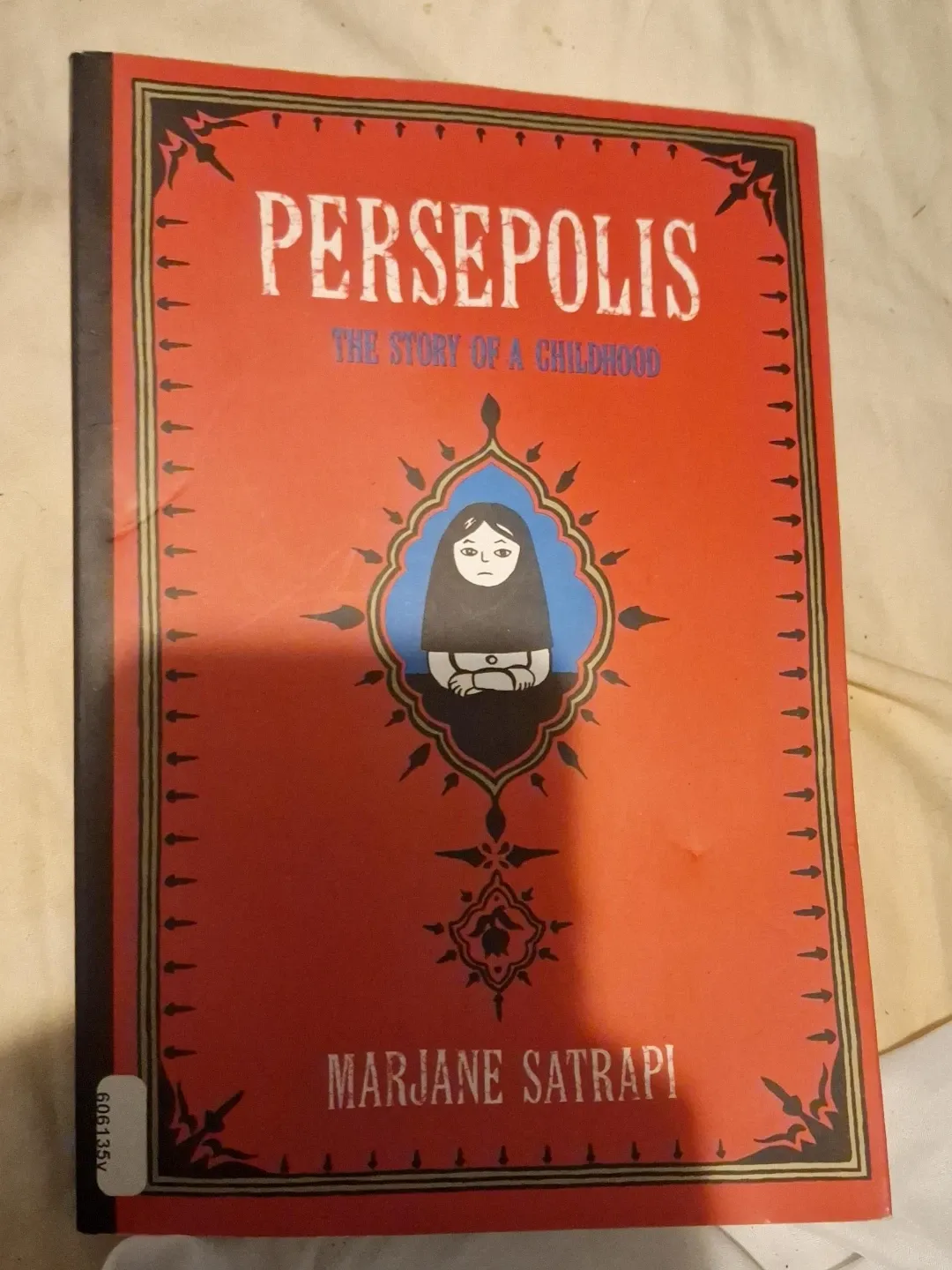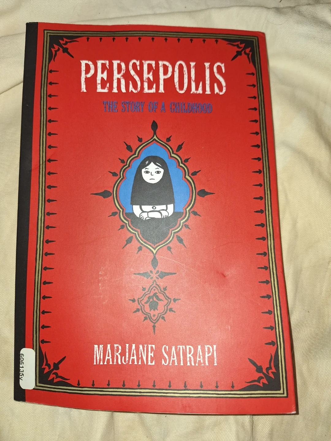This is Persepolis: The Story of a Childhood, a graphic novel memoir by Marjane Satrapi. It chronicles her childhood in Iran during the Islamic Revolution. This edition was published by Pantheon Books in 2004.