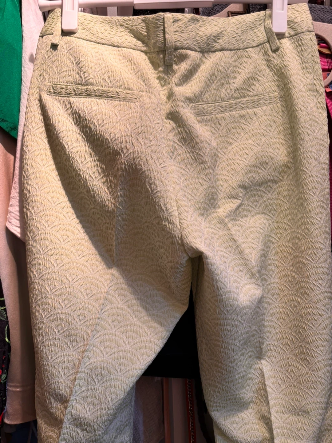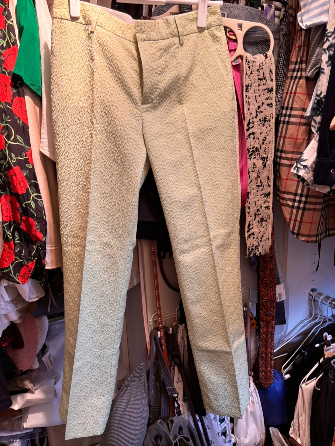 These are a pair of See by Chloé nice trousers in a light green colour. The material is 78% polyester and 22% acrylic, giving them a unique textured look. They're in great condition