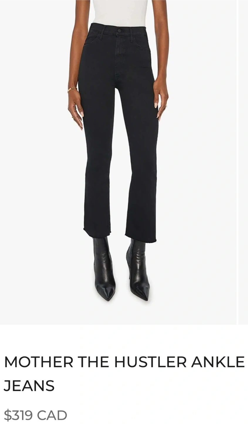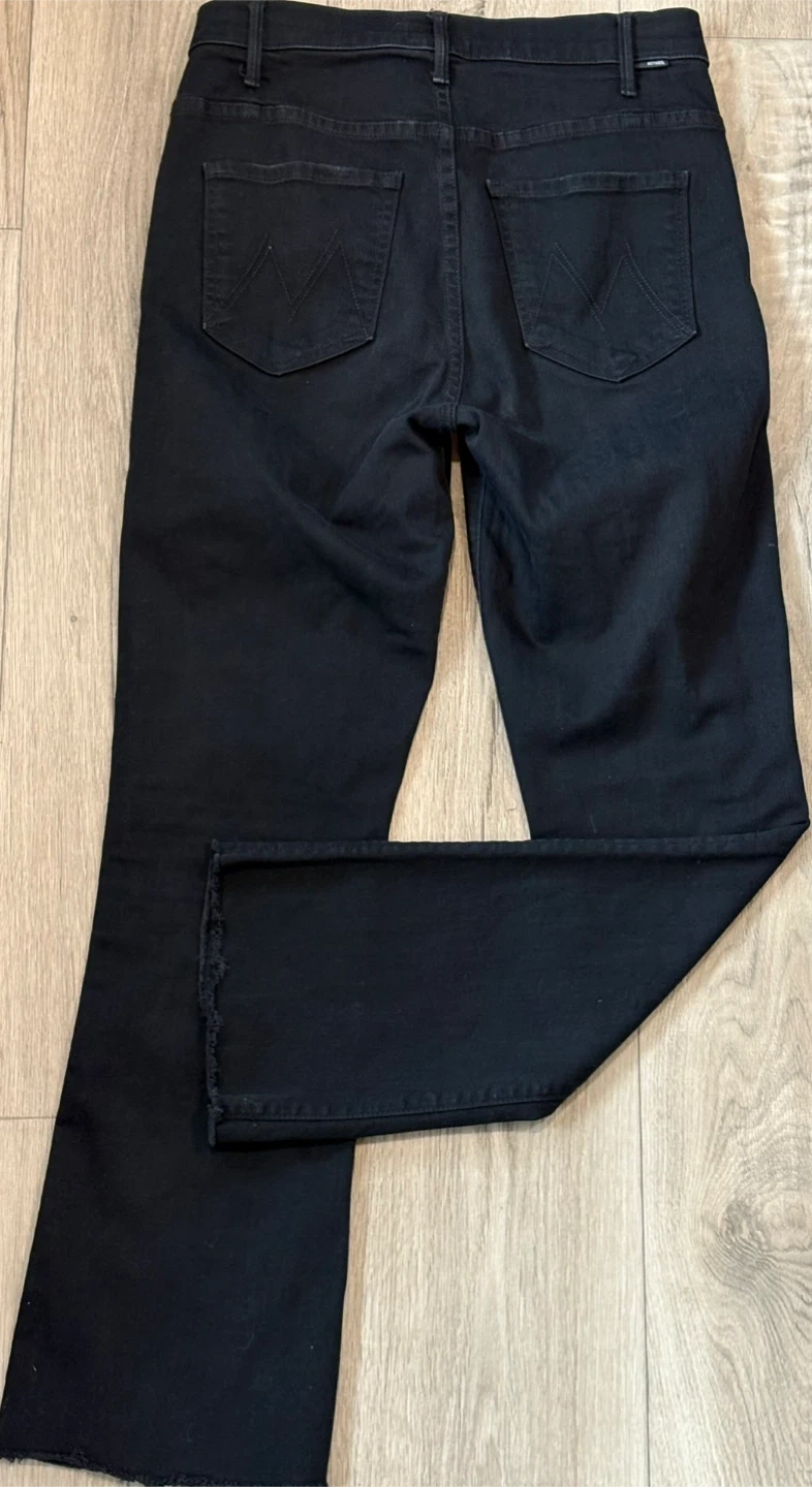 MOTHER The Hustler Ankle Jeans in black. Size 26. These jeans have a high rise and a slight flare at the ankle. They're made with a cotton blend for comfort.