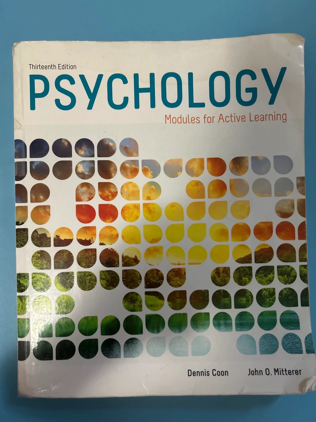 Selling a textbook titled "Psychology: Modules for Active Learning", Thirteenth Edition, by Dennis Coon and John O. Mitterer. It's in good condition and ready for a new student to use!