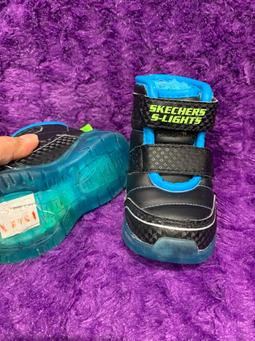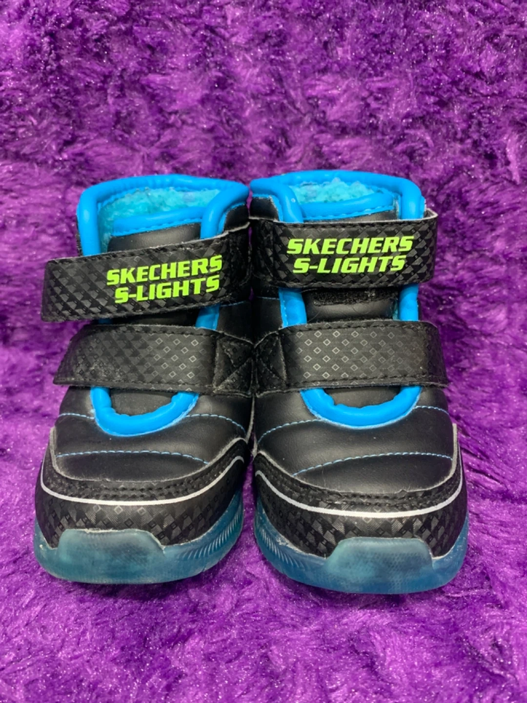 These Skechers S-Lights shoes are black and blue. They have adjustable velcro straps for a secure fit. Perfect for little ones who love fun, light-up footwear!