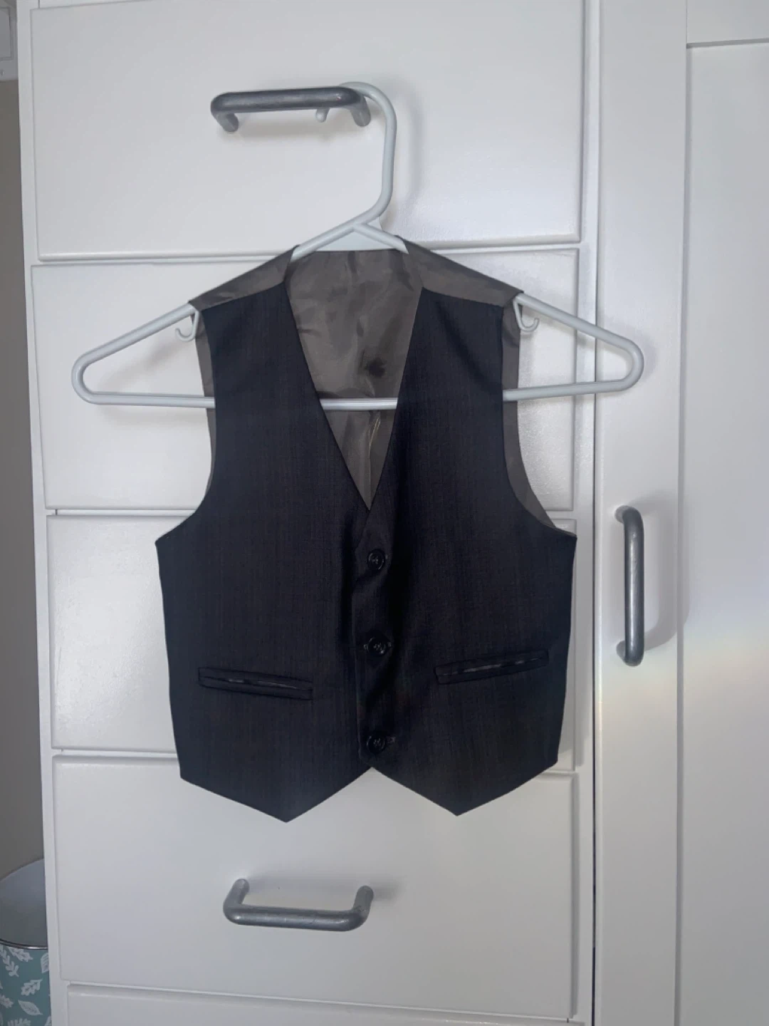 A three-piece suit for boys, including a blazer, vest, and matching pants. The suit is dark grey with a subtle pinstripe pattern. It's ready for any special occasion!