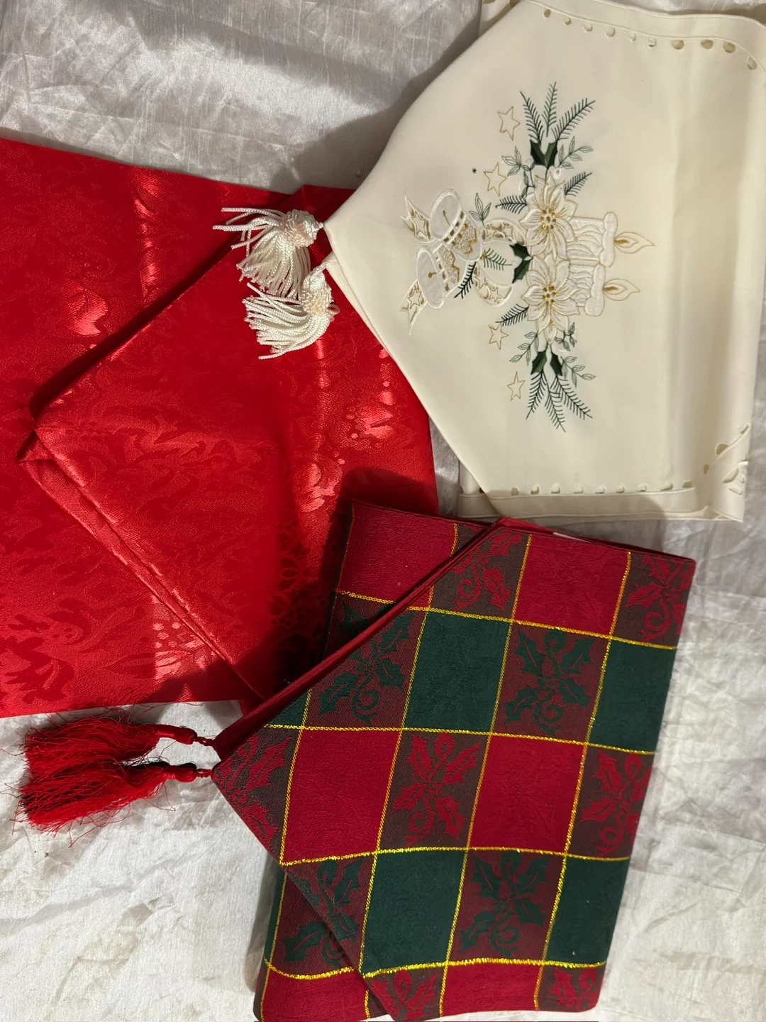 Three festive table runners perfect for the holiday season! One features a classic red and green plaid pattern with gold accents. Another is a solid red with an embossed damask design. The third is cream-coloured with a beautiful embroidered Christmas motif including candles, poinsettias, and bells. They're a lovely way to decorate your dining table for gatherings!