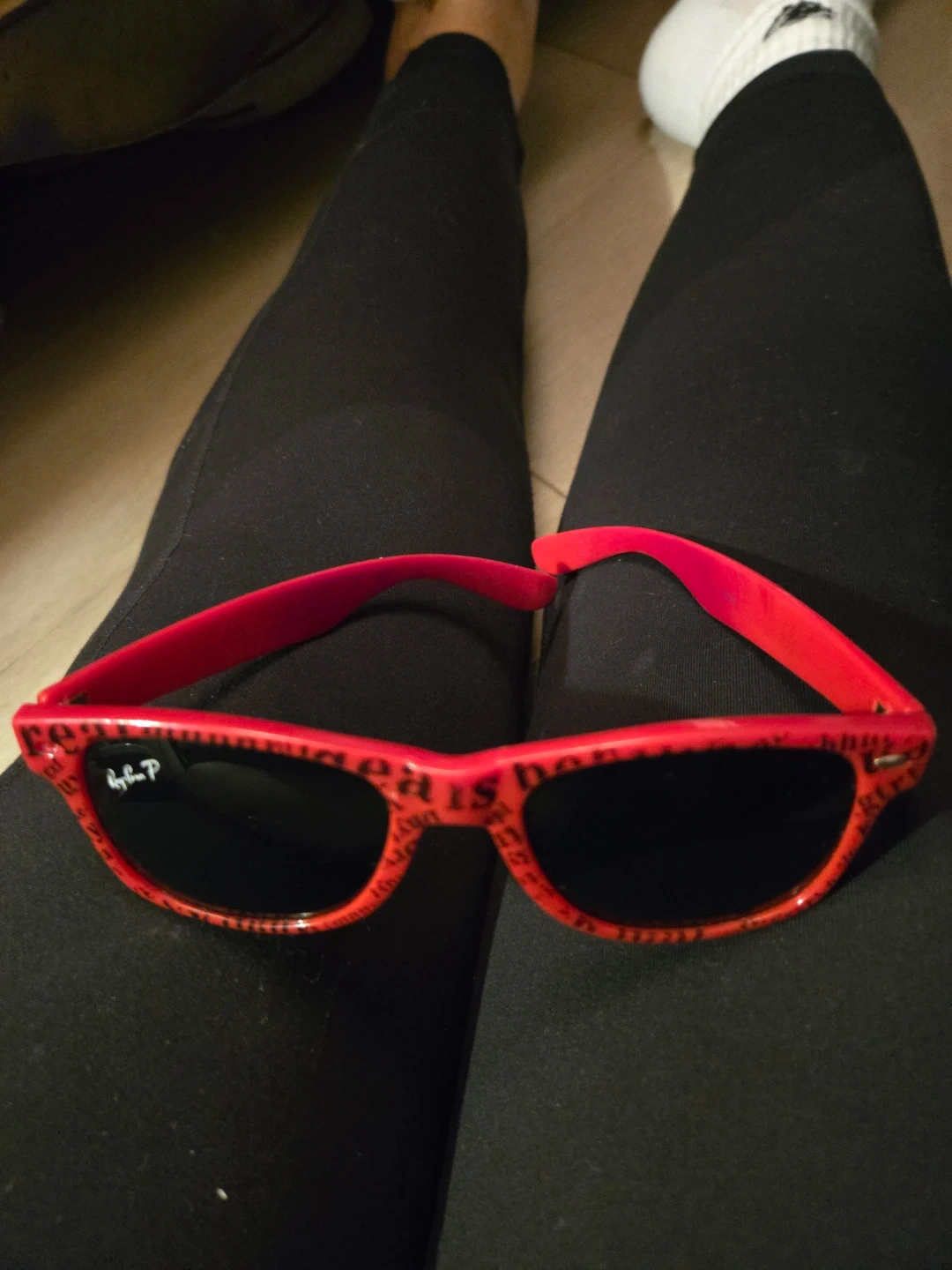 These are red Ray-Ban Wayfarer sunglasses with a graphic print on the frames. They offer classic styling with a bold look. Perfect for sunny days!