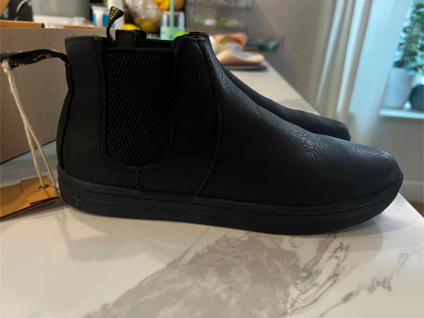 Dr. Martens Katya Chelsea boots in Black Noir, size 6. These boots are made with Burnished Wyoming leather. They come in the original box with tags attached.