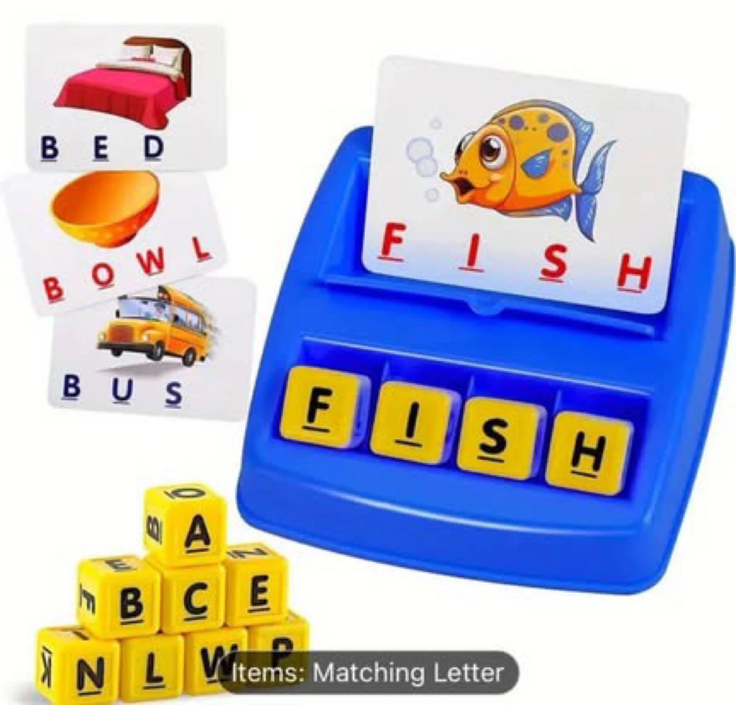 This matching letter game helps children learn words. It includes picture cards like 'BED', 'BOWL', 'BUS', and 'FISH' along with letter blocks. This toy's great for early learning!