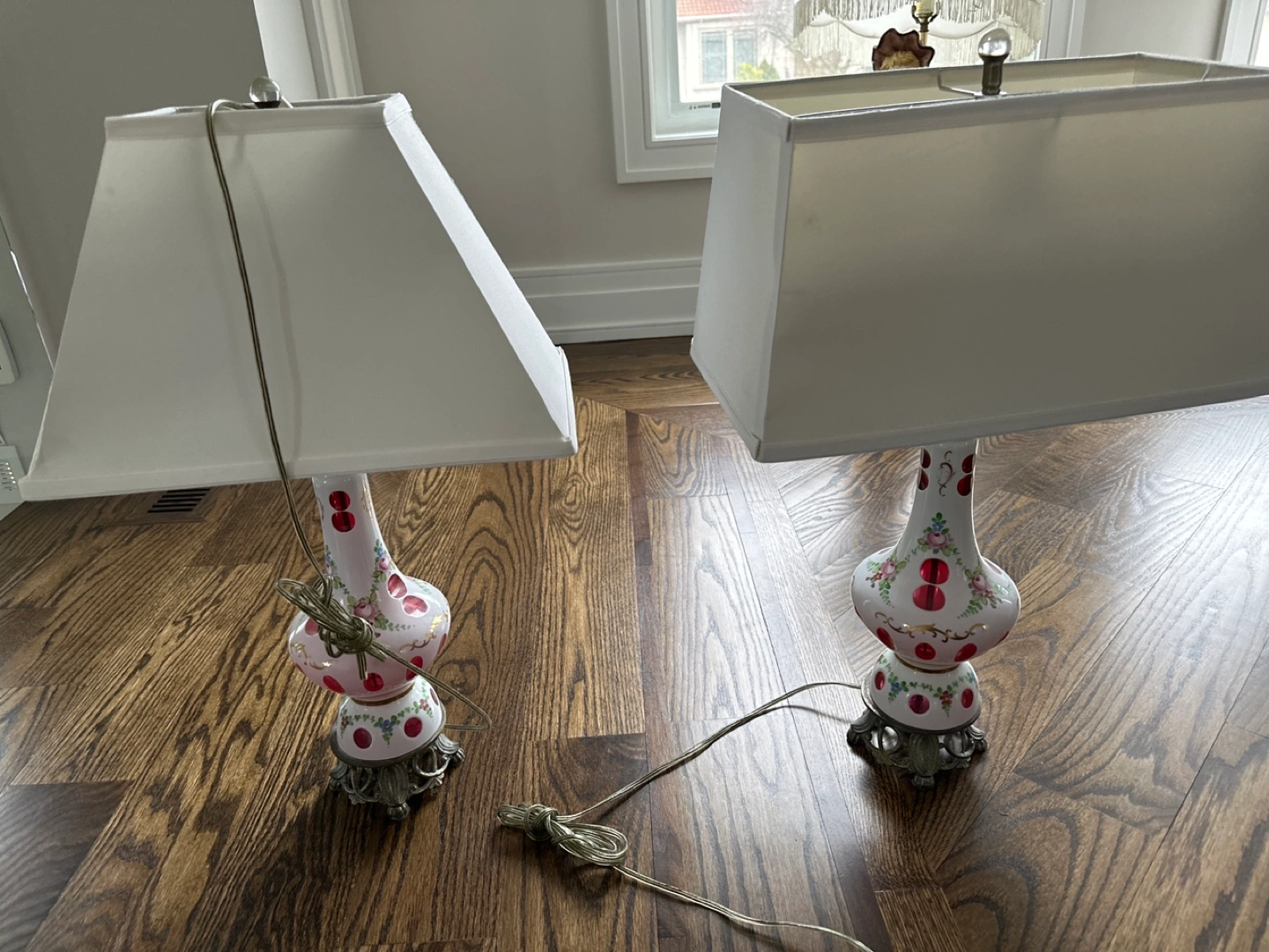 Stunning pair of antique Bohemian glass table lamps. Features hand-painted floral designs and red accents. Elegant lamps with ornate bases and off-white shades. Perfect for a vintage or eclectic décor.