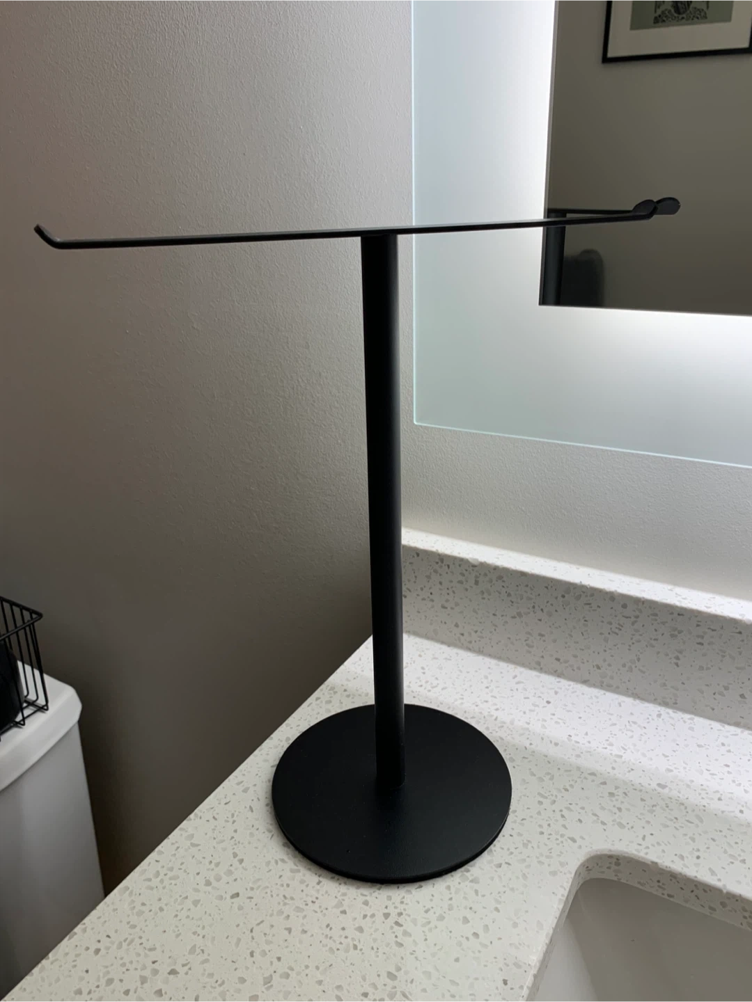 A sleek, black freestanding handle towel, jewelry or toilet paper holder. It's made of metal and features a modern design with a circular base. It can also be used as a toilet paper holder and it holds one roll and is perfect for easy access in the bathroom.