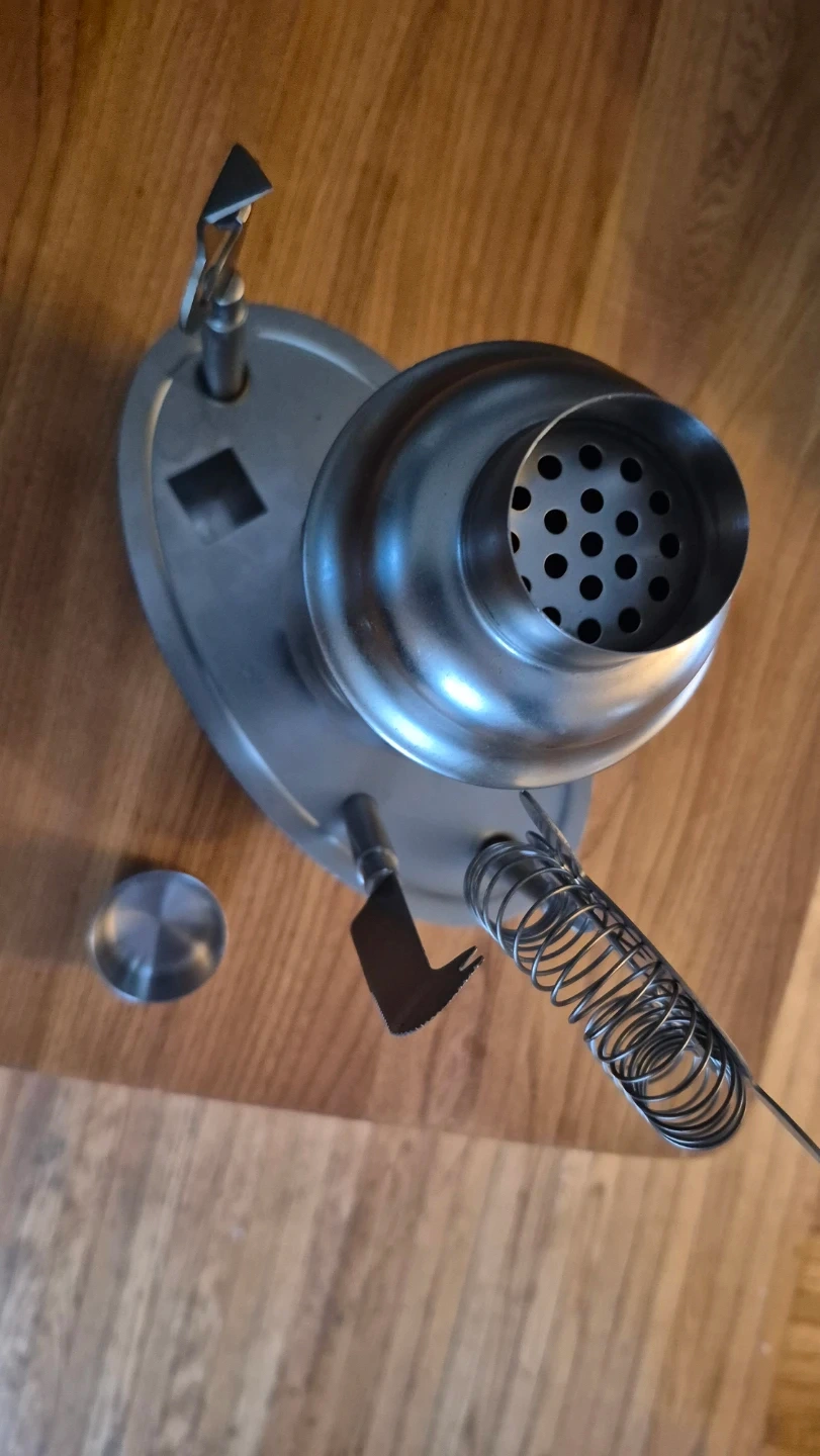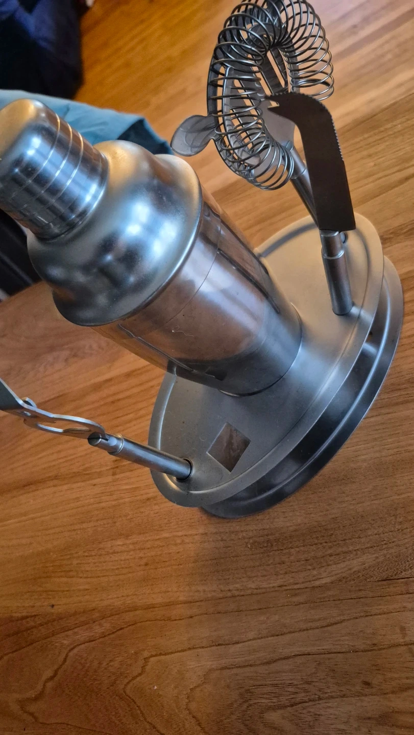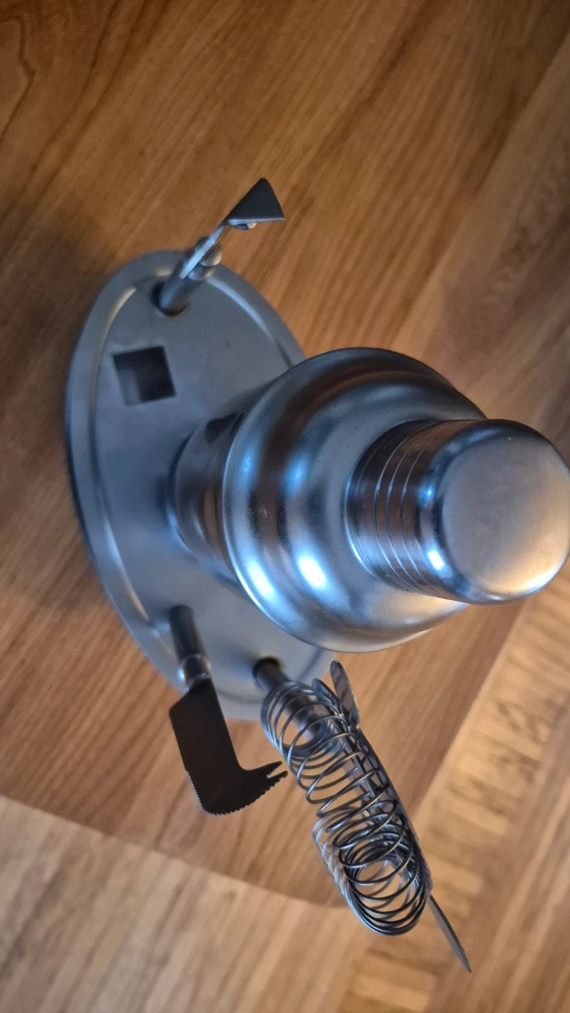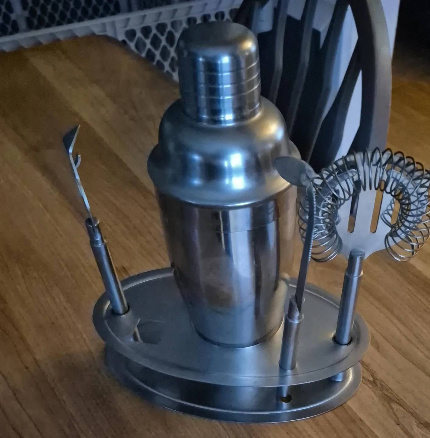 This is a stainless steel cocktail shaker set. It includes a shaker, strainer, jigger, and other bar tools. Everything fits neatly on the included stand. Like new, but missing tongs.