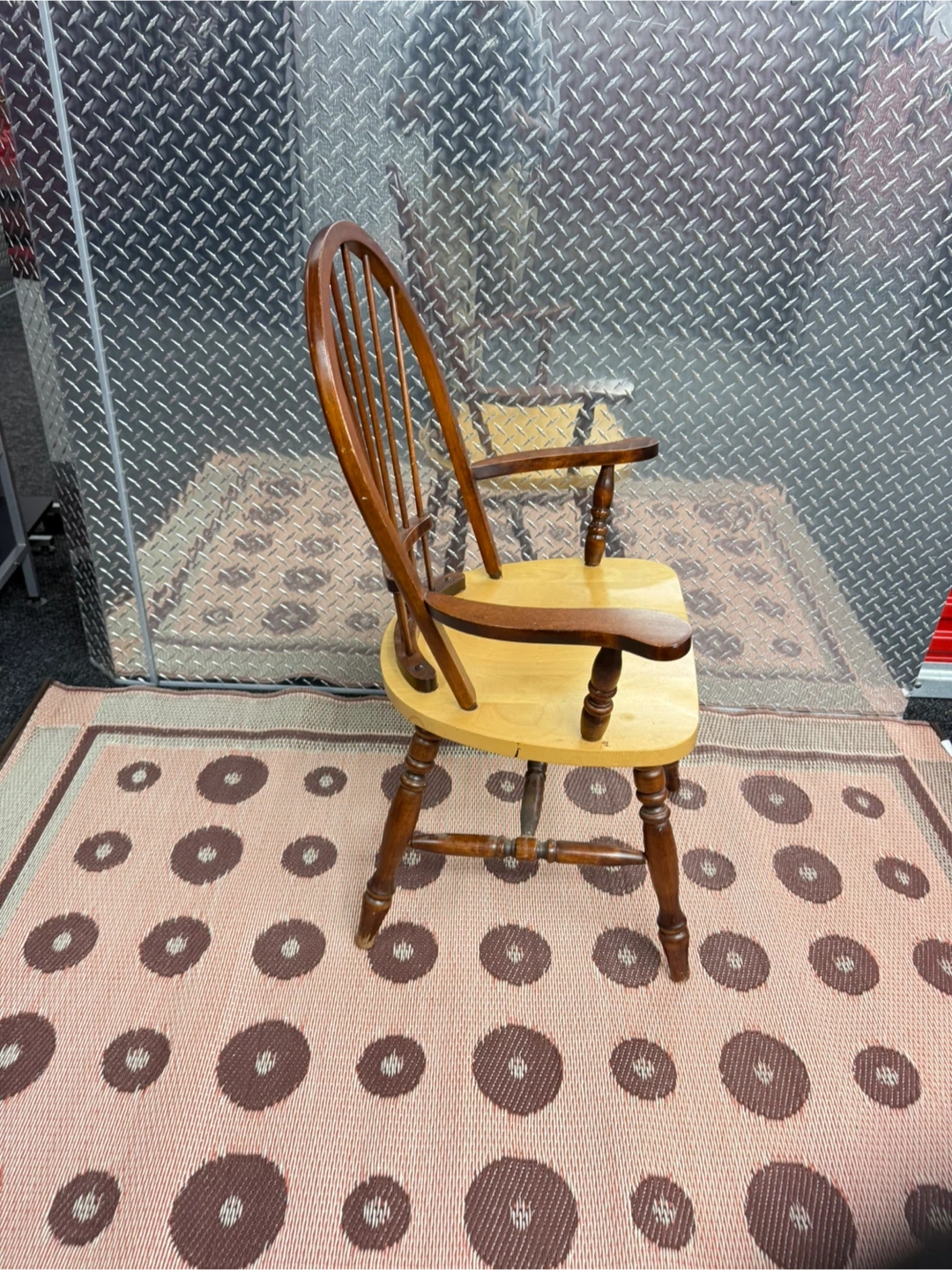 This is a classic Windsor style armchair with a wooden frame. It features a curved spindle back and solid wood seat. Its sturdy construction makes it a reliable seating option. The chair's timeless design complements various home decors.