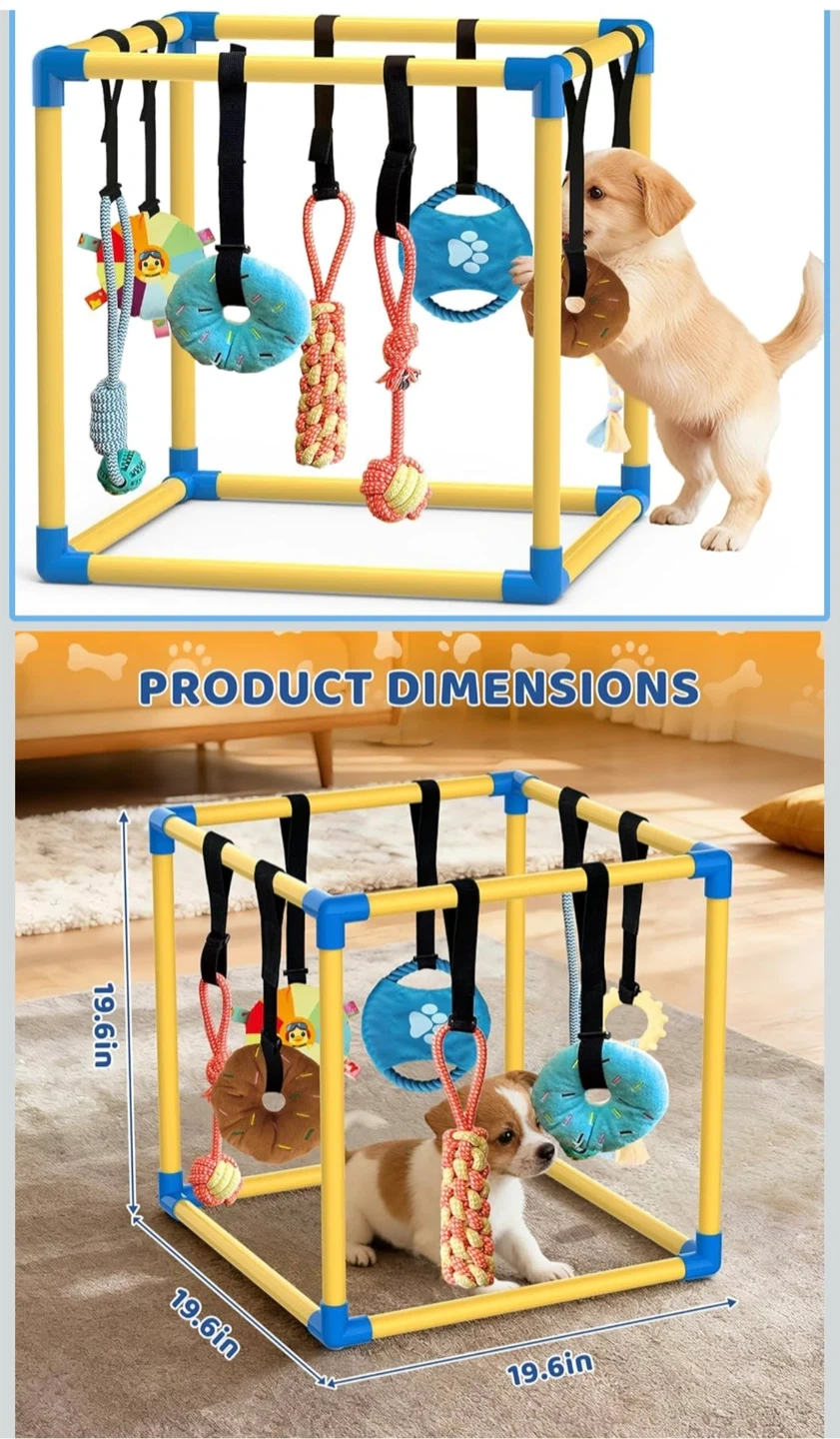 Puppy Play Gym with 8 Hanging Toys Indoor Play Gym Interactive Dog Toys for Boredom Enrichment Activity for Small Dog Teething PVC Frame Stretchy Rope with Velcro (19.6 x 19.6 x 19.6 inch)