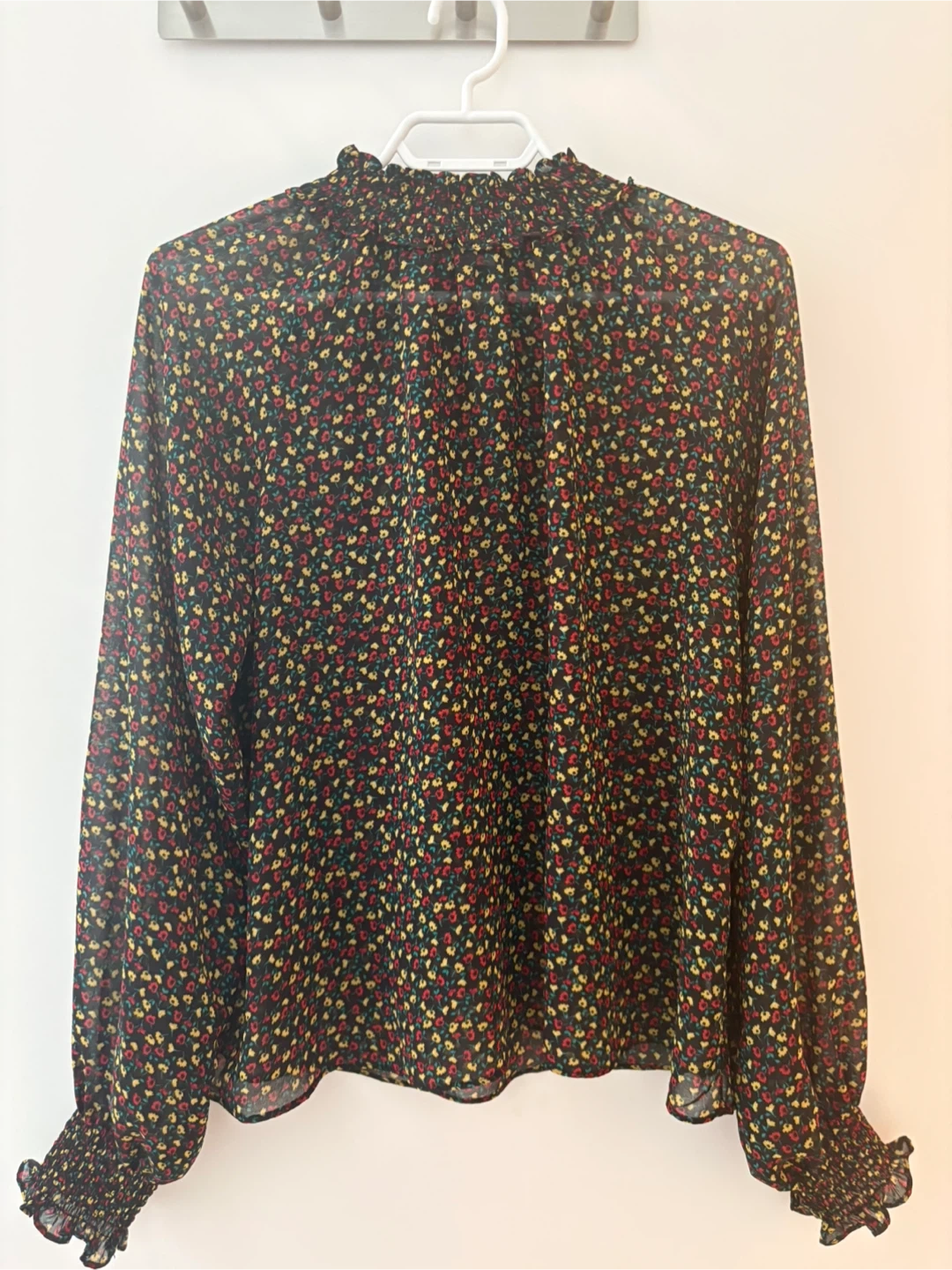 This Gap blouse features a dark floral print with red, yellow, and blue flowers. It has a ruffled mock neck and smocked cuffs. The fabric is lightweight and sheer.