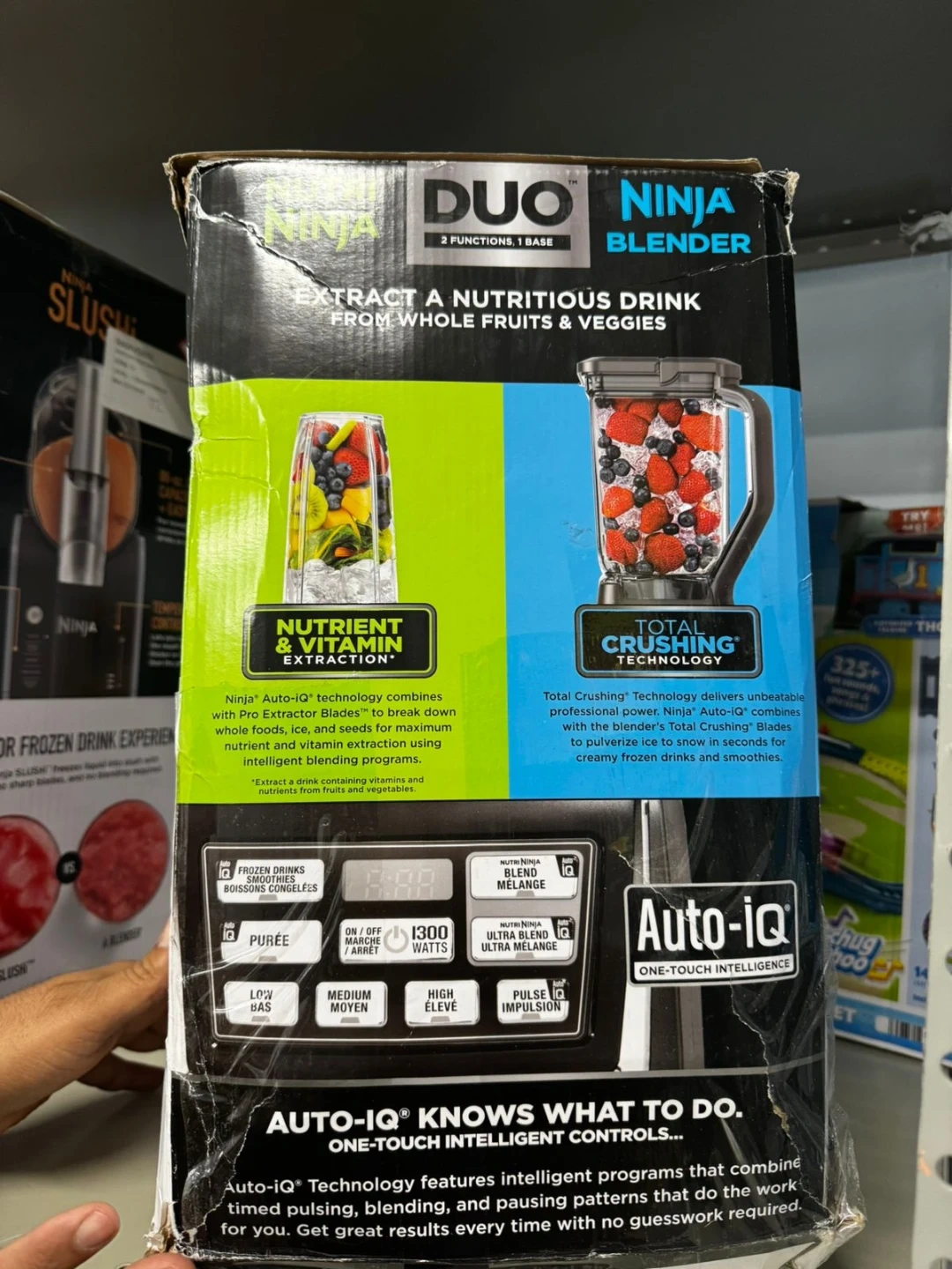 This Ninja Duo blender offers Nutrient & Vitamin Extraction and Total Crushing Technology. It features Auto-IQ one-touch intelligence with multiple pre-programmed settings. The pitcher is 2.2 L (72 oz).