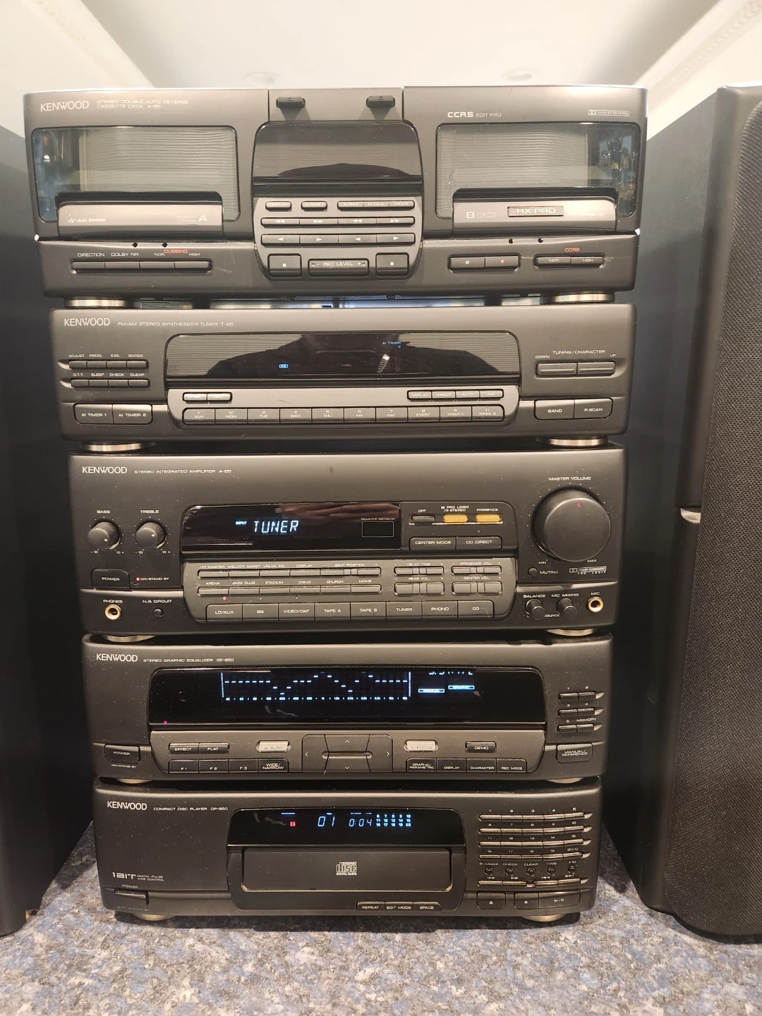 Selling a Kenwood stereo system. Includes a tape deck, tuner, amplifier, equalizer, and CD player. Also comes with speakers. Great for anyone looking for a vintage audio setup