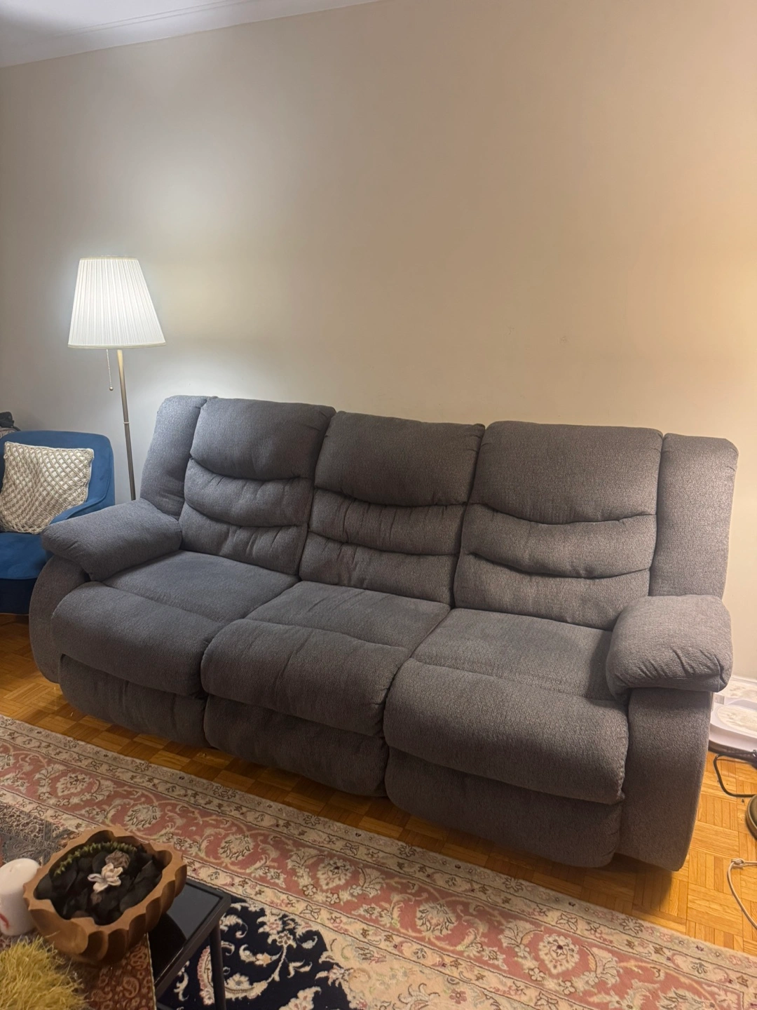 Grey fabric three-seater reclining sofa. It has padded arms and a plush back. This sofa is comfortable for lounging and watching TV.
