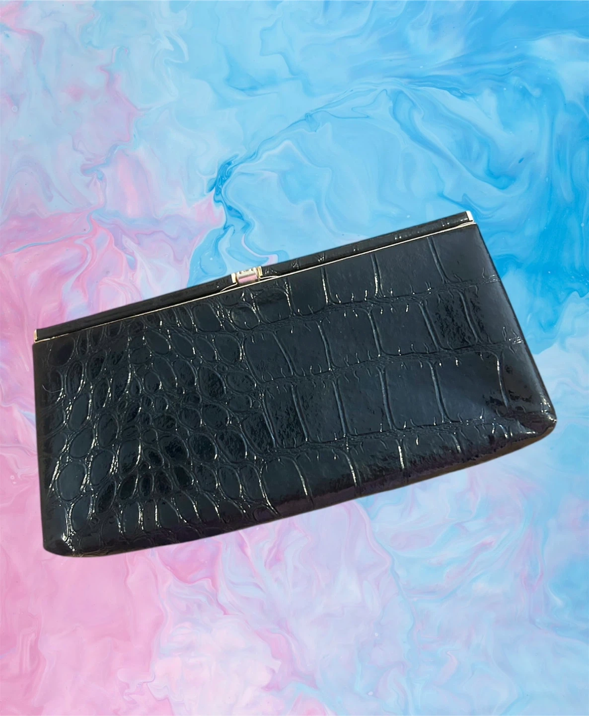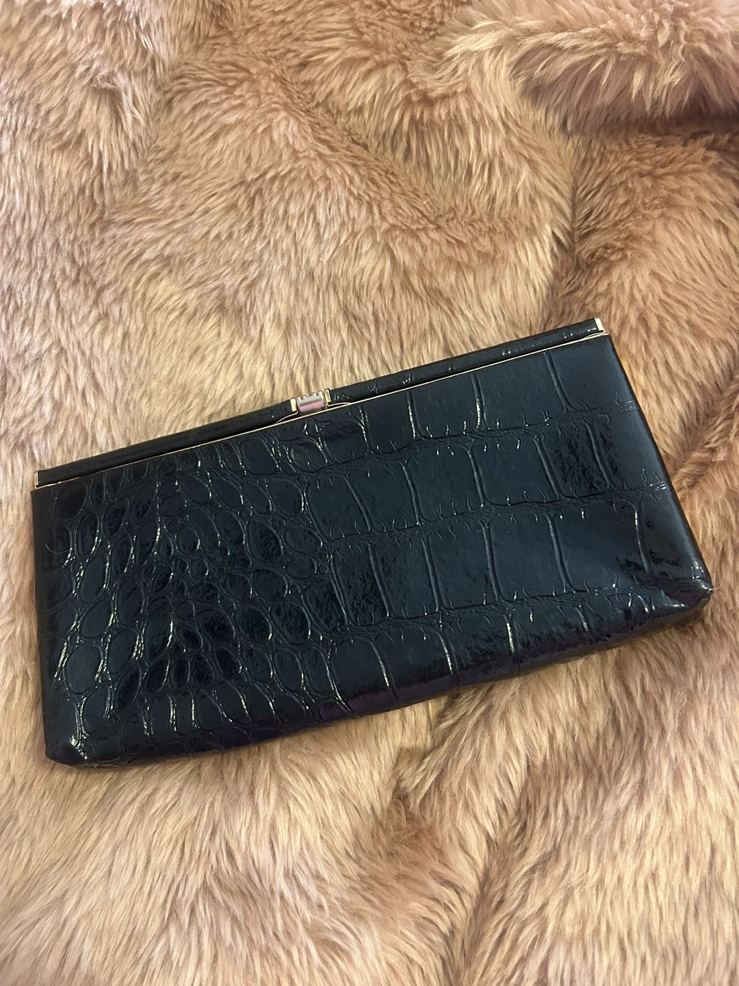 BLACK SHINY CROC-EMBOSSED LEATHER CLUTCH HANDBAG