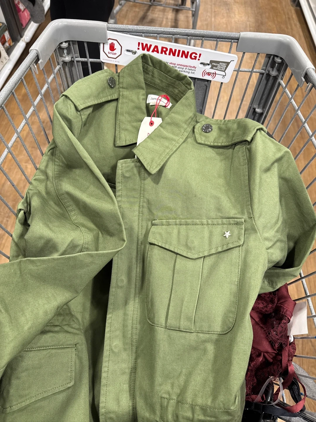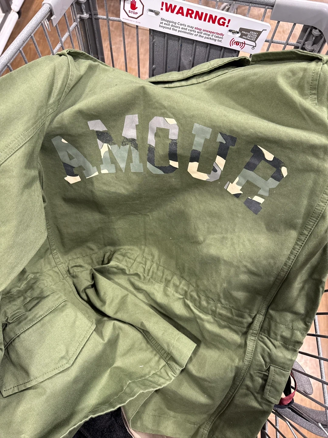 Green cotton military-style jacket with 'Amour' graphic on the back. It's a size medium and made in Madagascar. This jacket has button closures and multiple pockets.