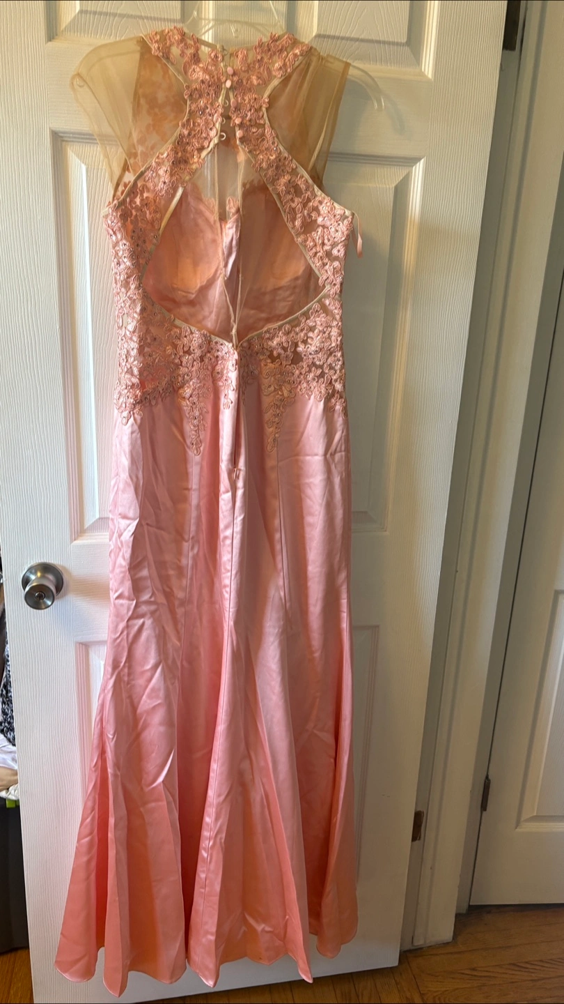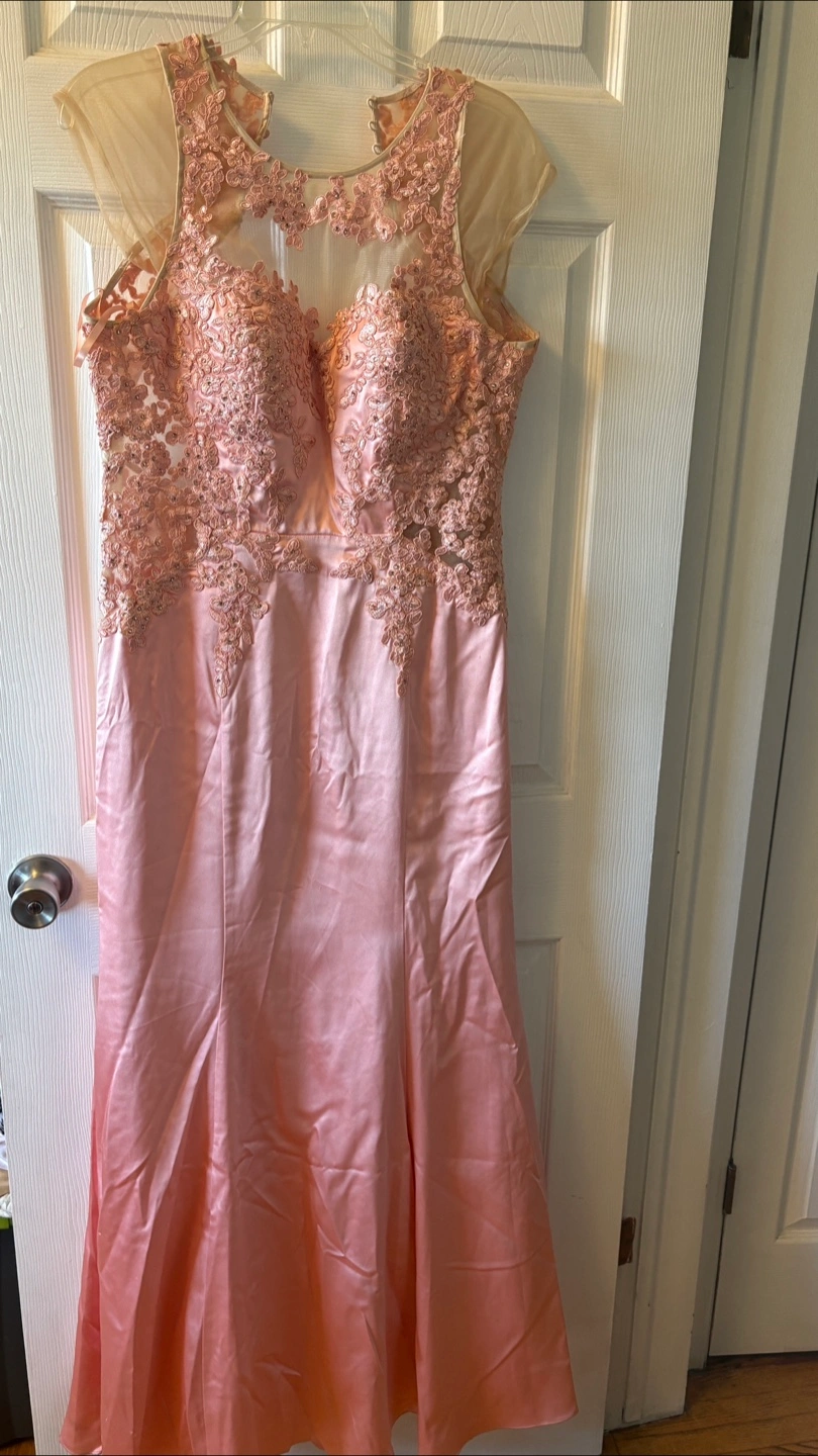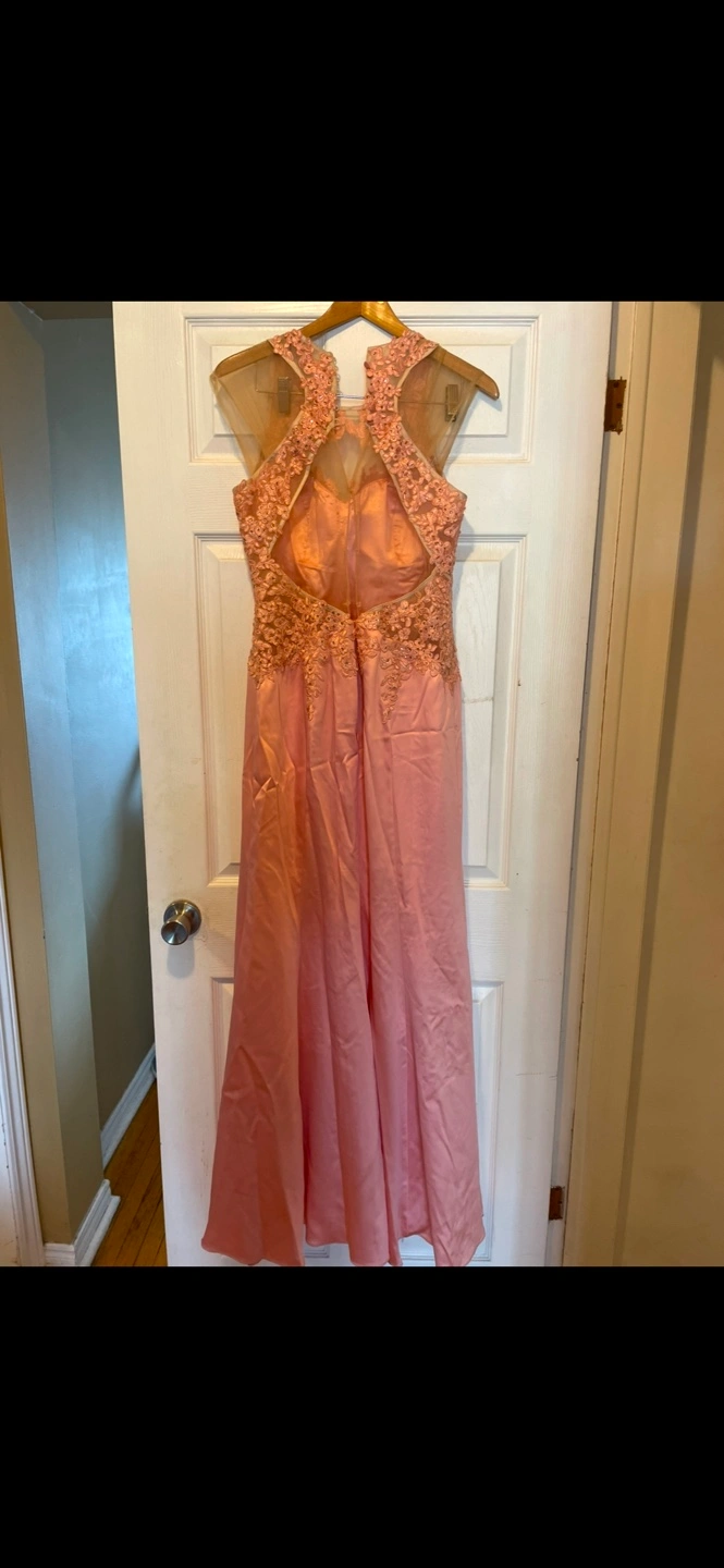 A stunning pink formal dress. Appears to have a sheer neckline. The bodice is beautifully decorated. The dress is a floor length style. A perfect choice for a special event, where you can feel like a princess.