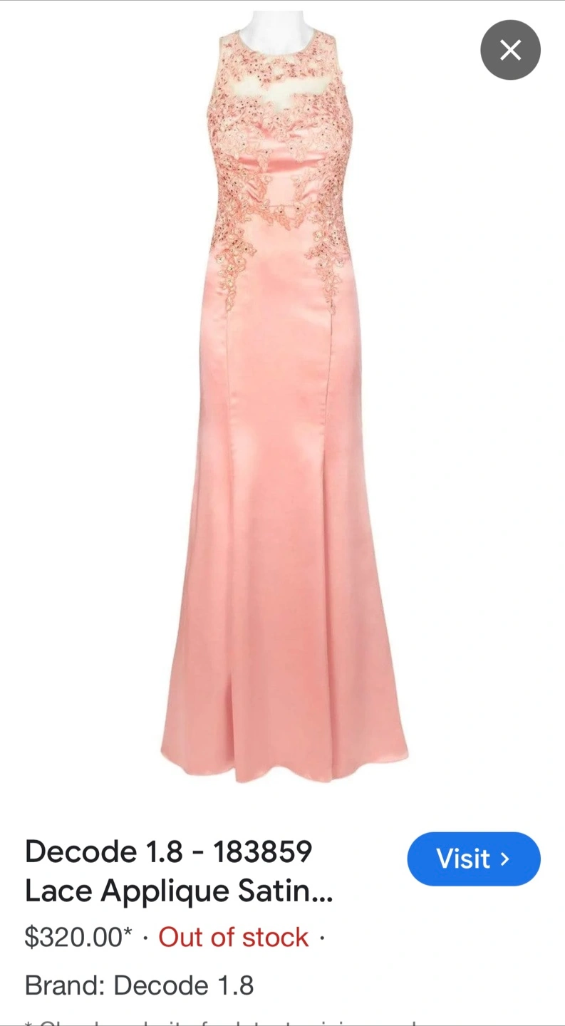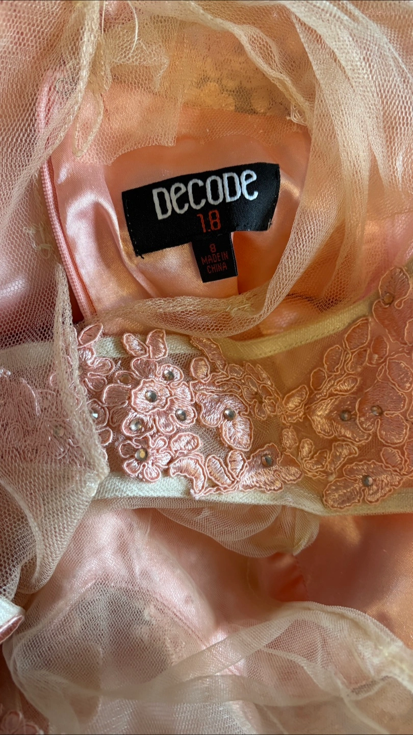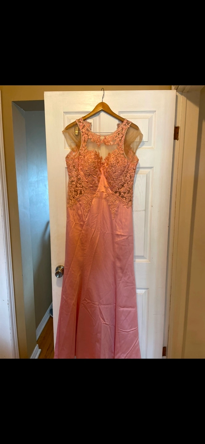 A stunning pink formal dress. Appears to have a sheer neckline. The bodice is beautifully decorated. The dress is a floor length style. A perfect choice for a special event, where you can feel like a princess.